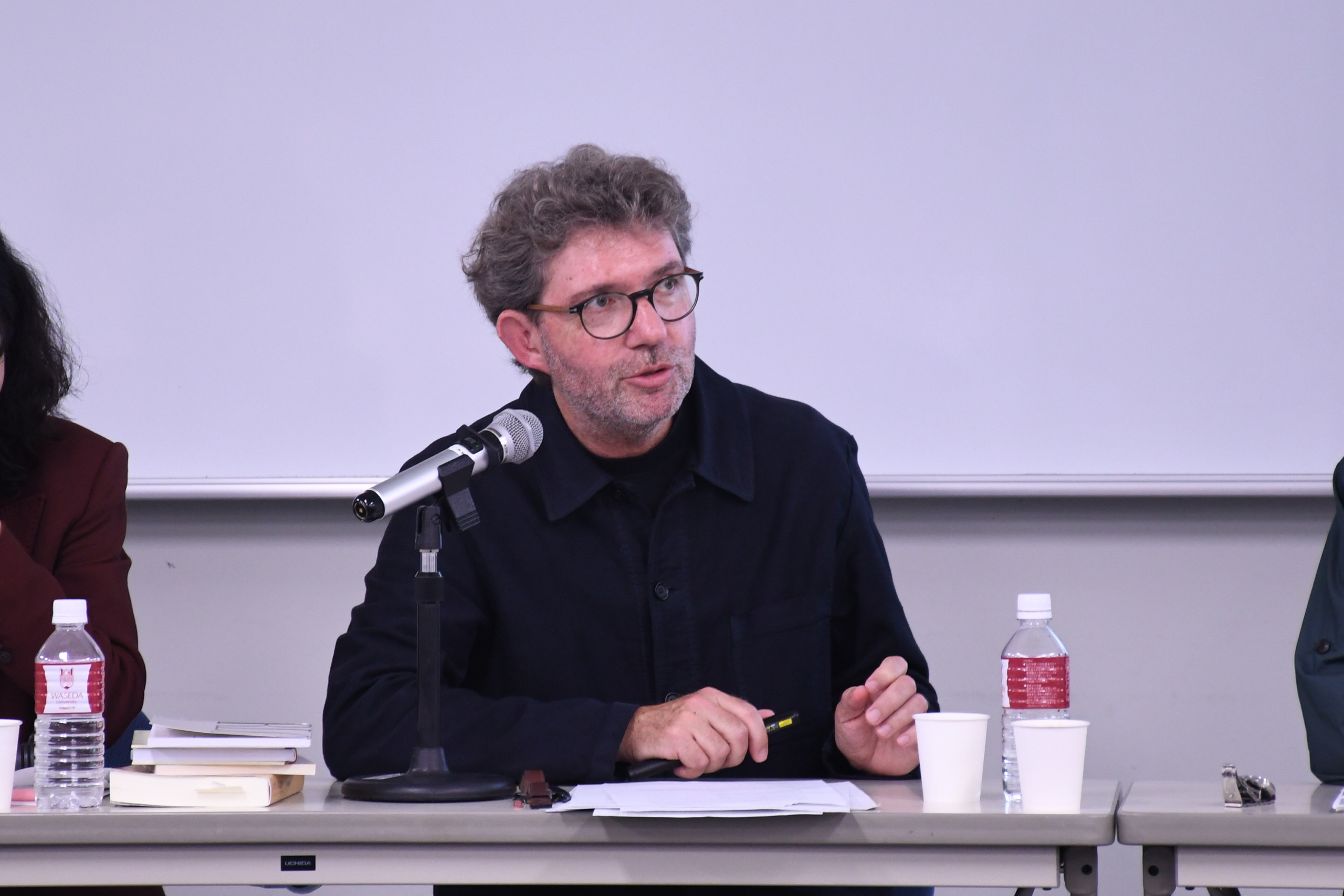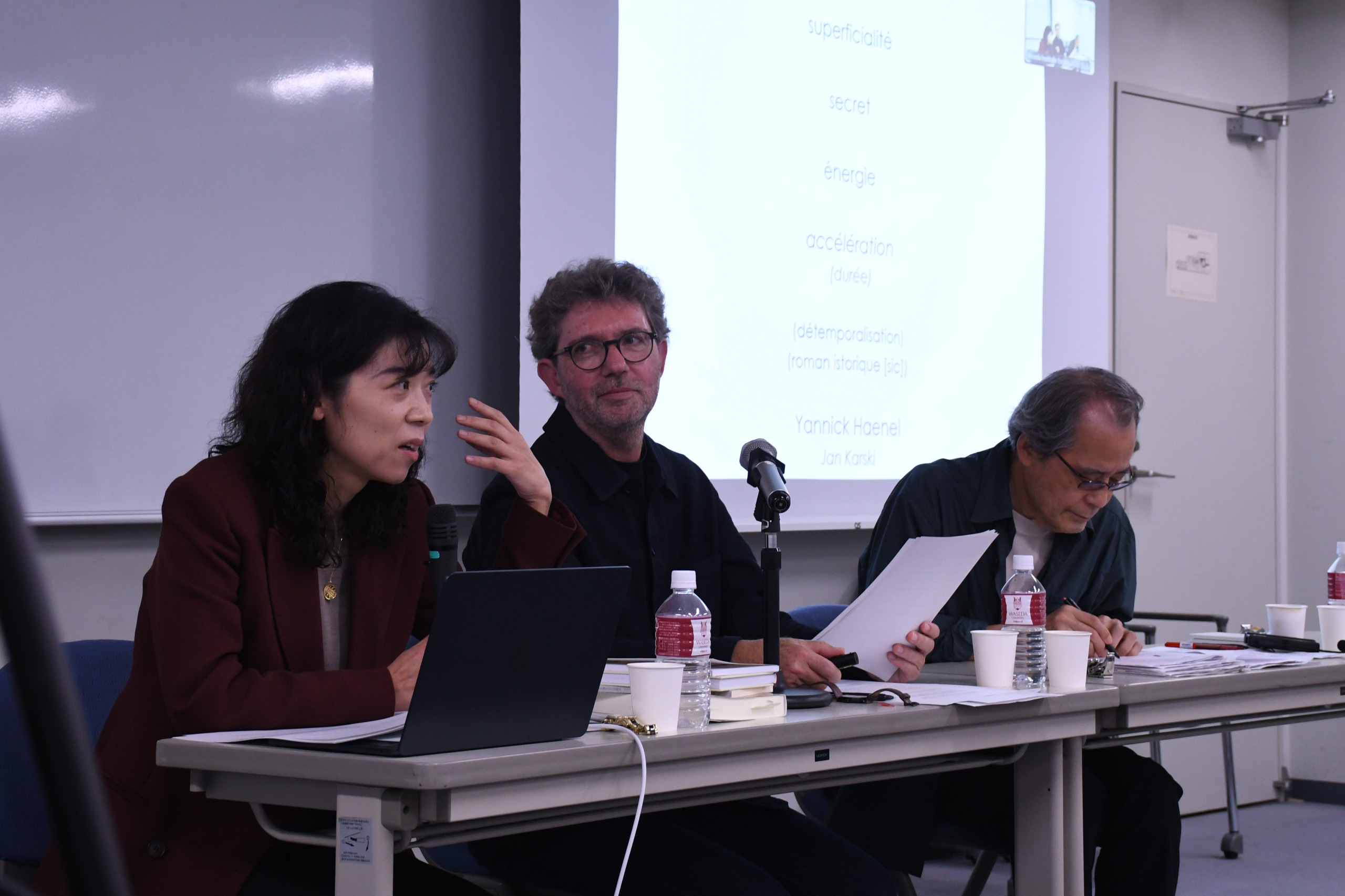 休憩後はPrincipe Princip(e)の分析例を踏まえ、松尾講師のコメントから始まりました。この「幻肢痛」のもとは必ずしも20世紀以降のものではなく、松尾講師の研究領域である19世紀ポーランドにも存在し、例えばショパンが作曲したスケルツォについて、この言葉は本来イタリア語で「冗談」を意味するにもかかわらず、彼はその楽曲に当時国家を奪われた深刻なポーランド情勢を込め、皮肉でもって「スケルツォ(冗談)」と題したことに言及しました。「深刻な冗談」として表現された当時の状況が、今日のポーランドにも「幻肢痛」として現れ、この講演会と同じ頃、ロシアによる領空侵犯のドローンがポーランド人たちの精神状態を脅かす中で、「ショパン国際ピアノコンクール」(第一次世界大戦の結果ポーランドが独立回復したことを記念し約100年前に創設されたイベント)の19回目がワルシャワで開催されていました。果たしてショパン以来の「幻肢痛」を「鏡箱」のように表現し苦痛を和らげられる演奏家は、このコンクールで出てくるのだろうかという問いをフロアに投げかけた上で、「このように聴覚・視覚芸術でもエピモダニズムは適用できますか?」と、ブジュ教授に質問しました。教授の答えはOui!(できます!)であり、どの芸術分野も現代文学と同じ問題を抱えていることを述べた上で、「私はエピモダニズムだけで(世界の現状に対する)抵抗に十分だとは思っていません。しかし少しでも貢献できるなら、それでも意味があるでしょう。」と結論づけました。