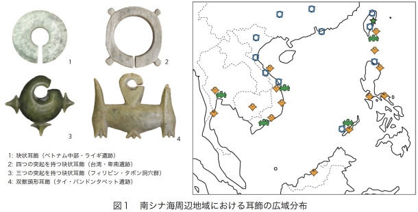 これらの「耳飾」は大きく4種類に分けられ、それぞれが少しずつ分布域を異にしながら南シナ海各地に分布しています(図1 右分布図に耳飾2・3・4の分布を図示)。最も普遍的に見られるのが玦状耳飾(環に切れ目のあるC字状を呈する。図1 左写真1)で、中国、東南アジア、ひいては日本でも確認されます。四つの突起を持つ玦状耳飾(図1 左写真2)は南シナ海域北半に分布が集中します。南シナ海南半に分布が集中するのは、三つの突起を持つ玦状耳飾(図1 左写真3)と双獣頭形耳飾(図1 左写真4)です。三つの突起を持つ玦状耳飾は球状の胴部から鋭利な三つの突起が突き出す形をしており、双獣頭形耳飾は左右に動物の頭部が付いています。