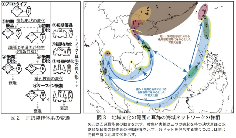 海域ネットワーク研究の理論面では、考古学者ウィルヘルム・ソルハイムII世が南シナ海を取り巻く文化の類似性に注目し、「ヌサンタオ海洋交易・交流ネットワーク」仮説を提唱しました。これは、海洋的指向性(海を中心に生き、海を通じてつながる性質)をもつ東南アジアの先住民が活発に活動した結果、地域的に似通った文化が生まれたとするものです。一方、考古学者ピーター・ベルウッドは言語学の研究成果を援用し、オーストロネシア語族が中国東南部から台湾を経て東南アジアへと拡散したという仮説を提示しました。それを受け、耳飾もこの拡散に伴って広域に分布するようになったと考えられるようになりました。