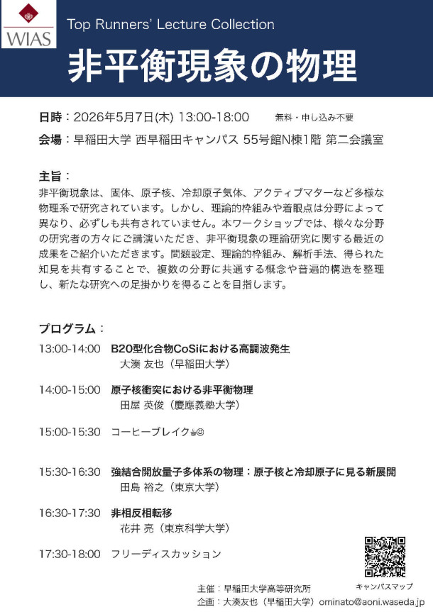 非平衡現象は、固体、原子核、冷却原子気体、アクティブマターなど多様な物理系で研究されています。しかし、理論的枠組みや着眼点は分野によって異なり、必ずしも共有されていません。本ワークショップでは、様々な分野の研究者の方々にご講演いただき、非平衡現象の理論研究に関する最近の成果をご紹介いただきます。問題設定、理論的枠組み、解析手法、得られた知見を共有することで、複数の分野に共通する概念や普遍的構造を整理し、新たな研究への足掛かりを得ることを目指します。
