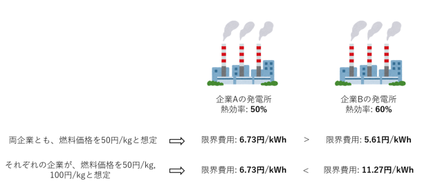 例えば、図1のように、企業A, Bがそれぞれ、熱効率50%, 60%のLNGガス火力発電所を所有している状況を考えます。この場合、本来であれば、発電効率のよい企業Bの発電所が優先して利用されるのが良さそうです。しかし、企業Bの想定するLNGガスの燃料価格が、企業Aの想定する燃料価格よりもかなり高い場合、現在の市場設計では、企業Bの発電所の利用に伴う費用は高いとみなされ、効率の悪い企業Aの発電所が優先して使われることになります。企業間で「燃料価格」に差が出るような状況は、燃料購入契約等の要因で十分ありえ、特に燃料価格が激しく変動している時期に顕著になりがちです。現在私の進めている実証研究によれば、まだ暫定的な結果にはなりますが、2021年秋のLNGガス価格の急騰期に、「企業間の燃料価格の差」に起因して日本のLNGガスの消費量が5~10%ほど増加し、日本のCO2排出量(全部門合計)が1%程度増加していたことが示唆されます。企業間の燃料価格の差を踏まえた望ましい市場制度設計に関しては政策的にもこれまで議論が乏しく、更なる検討が求められます。