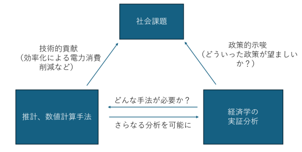 近年、AI等の普及で電力需要の増加が予想されているところで、計算負荷が大きく、電力消費の大きくなりがちな手法・アルゴリズムのさらなる効率化、省エネ化が求められます。経済学の分析における計算については、まだ社会的に問題になるほどまでには至っていませんが、計算コストが大きく、高性能の計算機を利用可能な研究者しかできないような経済学の分析は、分析の再現可能性等の観点からも望ましくありません。経済学の一つの目標は、電力や計算資源を含む希少な資源をいかに効率的に配分するかを明らかにすることです。私は、望ましい政策について経済学的な分析を行うだけでなく、その実現を支える技術的課題にも取り組んでいきたいと考えています。
