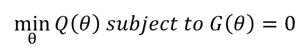 この問題では、G(θ)=0という条件を満たす範囲で、関数Q(θ)を最小化するようなパラメータθを求めます。一般に、手計算で問題を解くのは難しく、関数の微分などの情報をもとに、値を少しずつ更新していく操作を、値が解に十分近いと判断できるまで繰り返します。