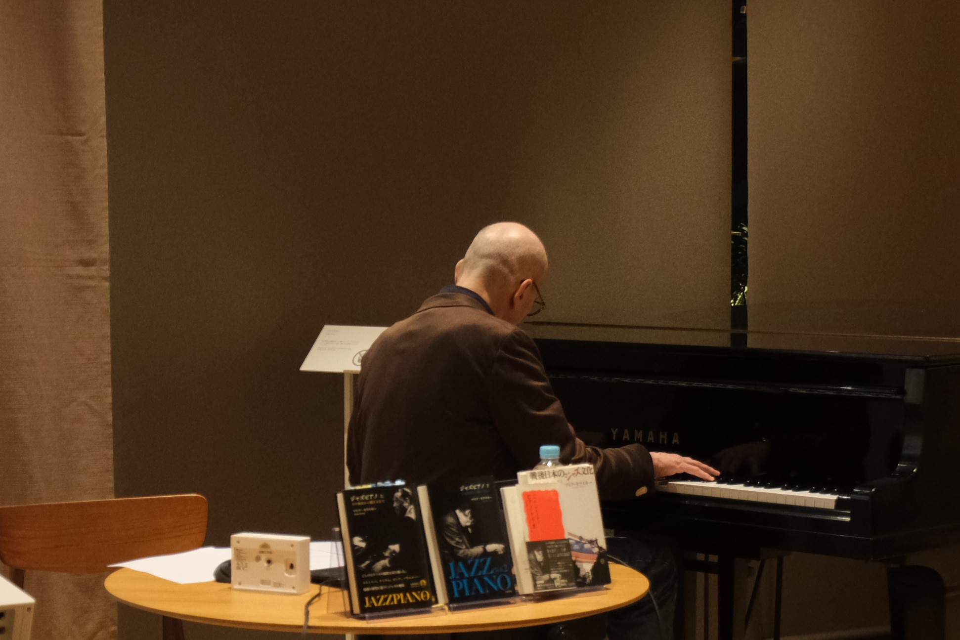「国際文学館ブッククラブ」第二回目は、日本文化史、ジャズ音楽研究者のマイク・モラスキーさんを迎え、「ピアノから聴くマイルス・デイビス黄金時代」をテーマにお話しいただきました。ジャズピアニストでもあるモラスキーさんは、開演前からマイルス・デイビス(以下、デイビス)の名曲を含めて演奏。そして、デイビスのバンドで活躍したピアニスト三人の来歴や演奏の特徴について、時折ピアノや音源を使いながら解説いただきました。