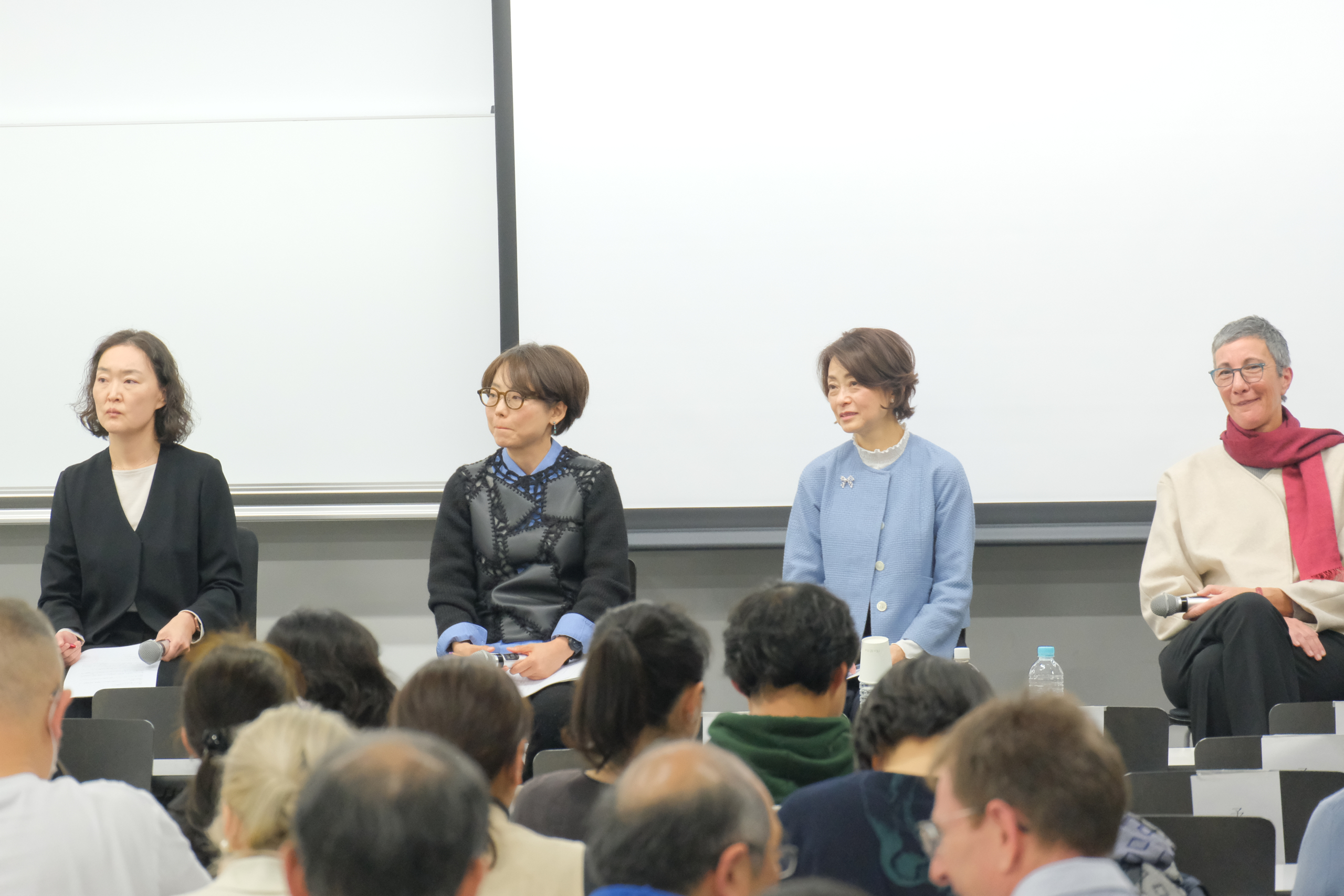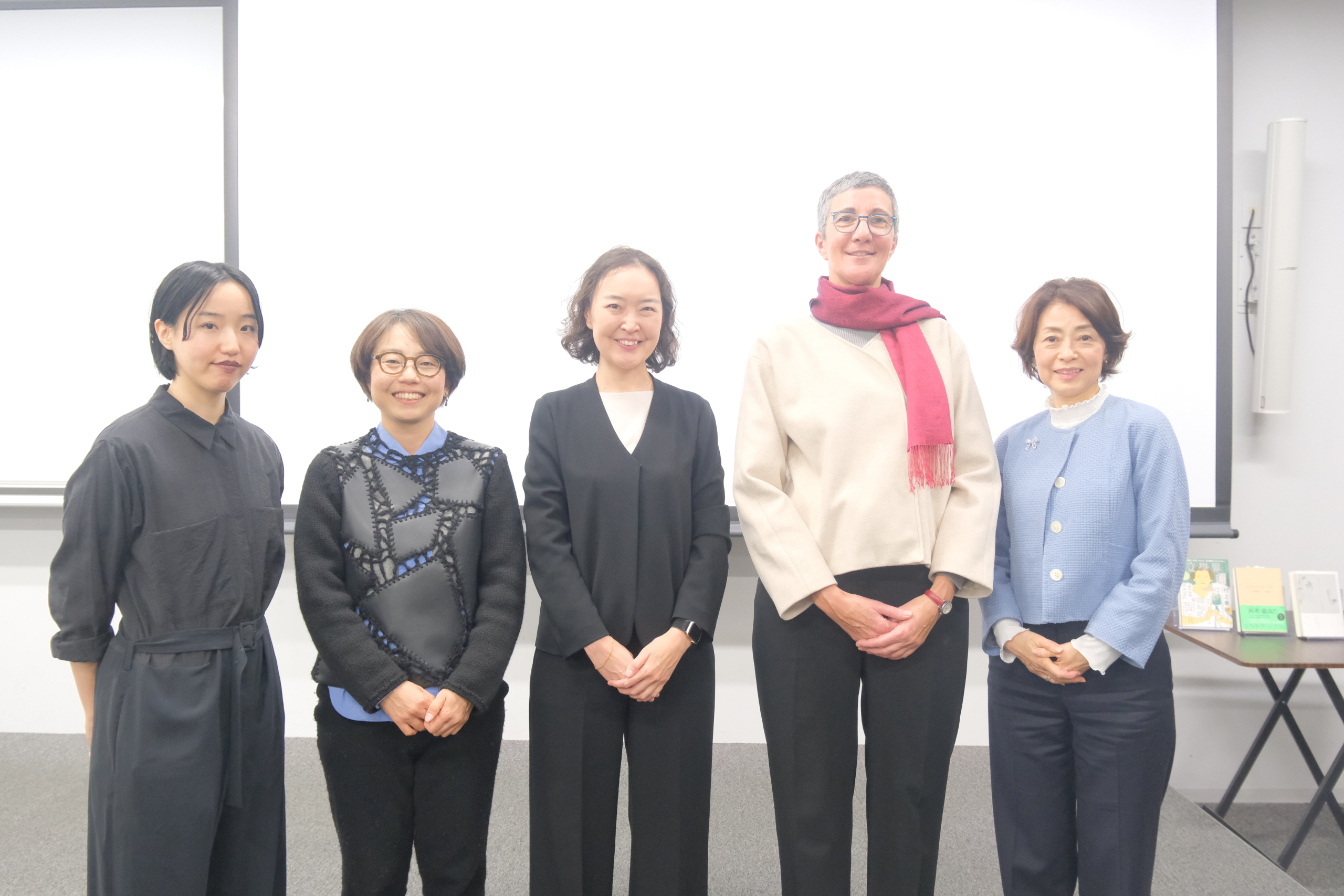 (左から)高田怜央さん(同時通訳)、永冨真梨さん、佐久間由梨副館長、マリー・ビュスカートさん、ウェルズ恵子さん