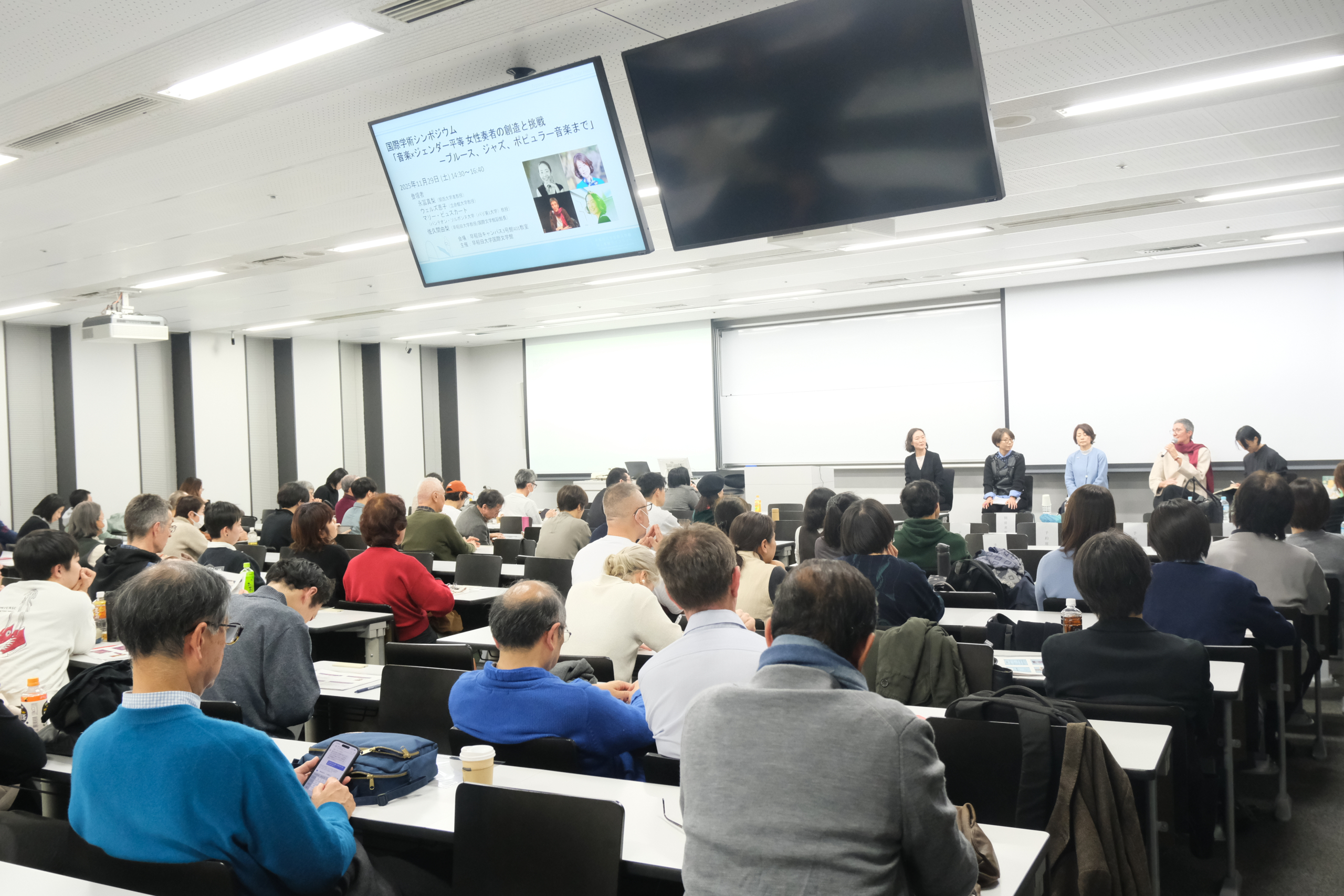 国際学術シンポジウム「音楽×ジェンダー平等 女性たちの創造と挑戦―ブルース、ジャズ、ポピュラー音楽まで」では、日仏4名の研究者による発表と質疑応答が行われ、およそ130名のオーディエンスが参加しました。