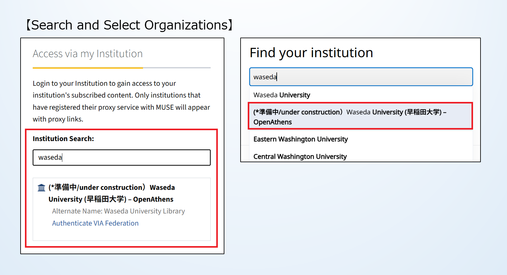 Q5. The institution name “Waseda University (早稲田大学)-OpenAthens” is not listed in Institution Login.