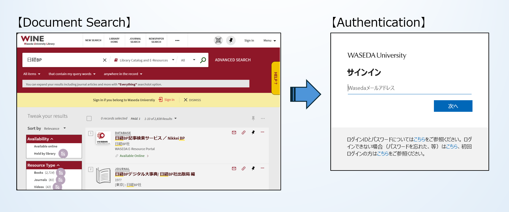 When using the service, you must log in and authenticate using your MyWaseda account (authentication uses the OpenAthens system).