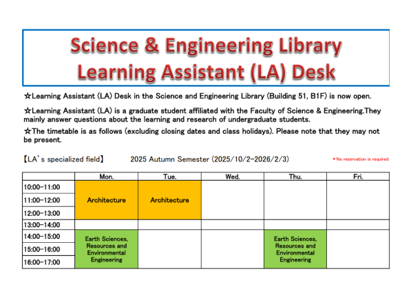 Learning Assistant (LA) is a graduate student affiliated with the Faculty of Science & Engineering. They mainly answer questions about the learning and research of undergraduate students.