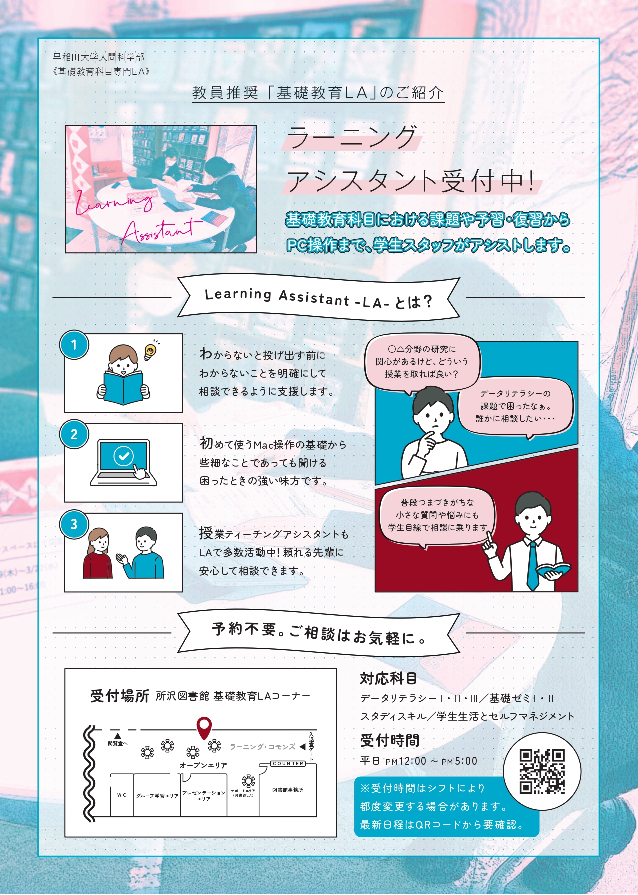 4月14日(火)より、人間科学部の基礎教育科目について、学生の自学自修をサポートする「基礎教育LA(ラーニングアシスタント)」がオープンします。