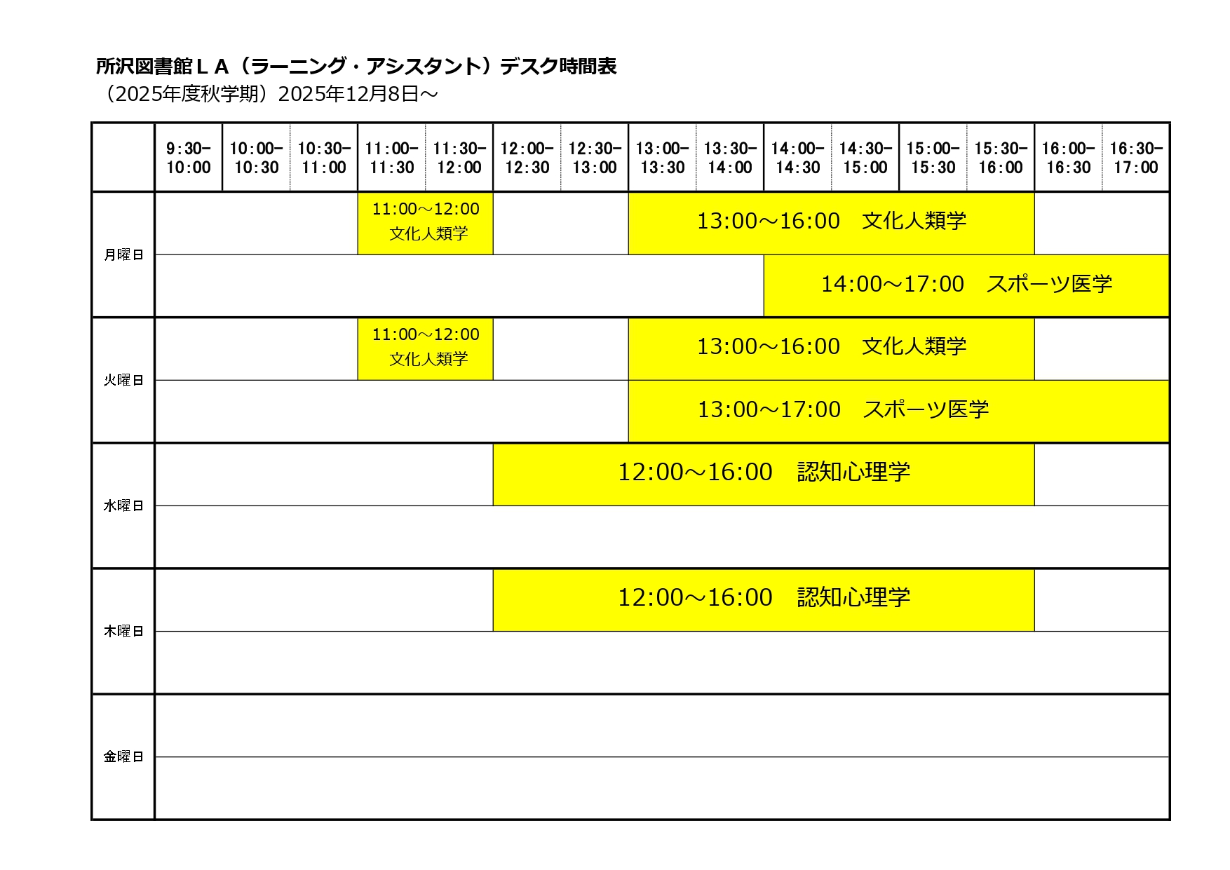 時間割は以下のとおりです(閉室時・授業休止期間を除く)。なお、不在の場合はご了承ください。