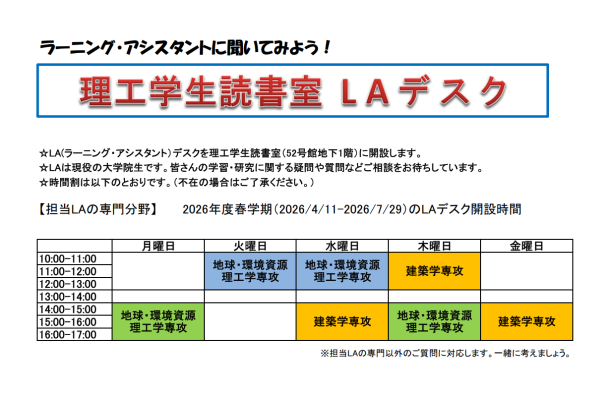 現役大学院生のLAが、皆さんの学習に関するお悩み、図書館サービスの質問にお答えします。