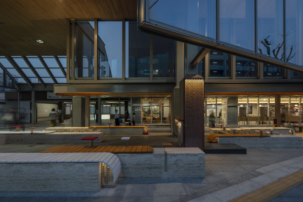 名鉄・東岡崎駅の屋根付き駅前広場「ガレリアプラザ(設計:瀧光夫 1998年竣工)」の修景整備。竣工から二十余年の間に付け加えられてきた屋外ベンチの排除ブロック、禁止事項等の多数の掲示物、仕上げ材の老朽化などを踏まえ、HIGAOKA2030(ひがおか(東岡崎駅)周辺地区整備事業)として行われた第一期整備です。現状の入念なリサーチを行ったうえで、瀧光夫のデザインを受け継ぎながら、現代に相応しいパブリックスペースへと更新しました。