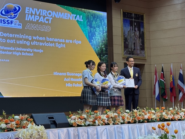 午前中、生徒による口頭発表。本庄学院からは2年野崎葵・福居美緒・末長ひなのが”Determining When Bananas Are Ripe to Eat Using Ultraviolet Light”というテーマで発表した。内容は、バナナのシュガースポット(熟すと皮に現れる黒い斑点)とそれに紫外線を照射したときに見える円環(angel ring)の相関関係からバナナの食べ頃を判定するという内容である。プレゼンテーションも大変しっかりしており、また世界的な食料であるバナナが題材で内容がわかりやすかったせいか、会場から質問が殺到した。また、それへの回答もしっかりなされていた。午後は、チームに分かれてのワークショップ。