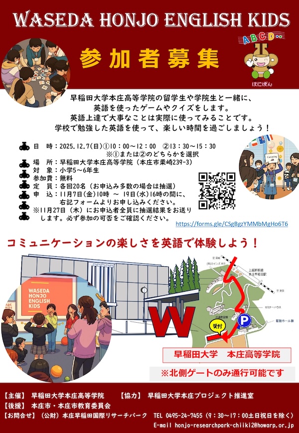 12/7(日)WASEDA HONJO ENGLISH KIDS参加者を募集します!