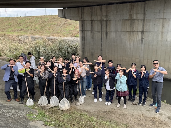 河川調査後の記念撮影。タイのTを作っている(つもり)。