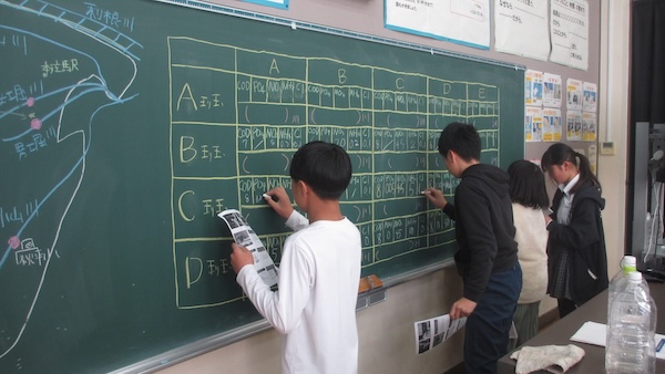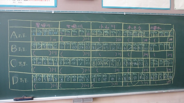 6時限目は、事前に採取しておいた小山川・男堀川・女堀川・水槽の水、および水道水の水質をパックテストで検査する実験を体験しました。板書した本庄市の地図を見ながら、どの川の水質がより良いかを考察し、結果から川の特徴について理解を深めてもらいました。数値からそれぞれの水の特徴がはっきりと表れ、本庄の川の水について学びを深めることができました。