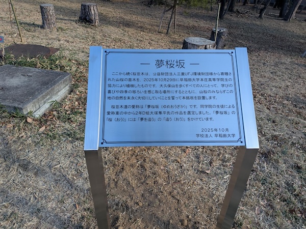 早稲田大学本庄キャンパスのセミナーハウスからグラウンドへ降る坂の両側に山桜を植樹し、坂の名前を「夢桜坂(ゆめおうざか)」と命名したことは過去のこのTopicsに掲載いたしました。
