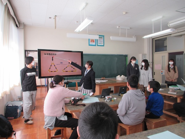 2月4日(水)、学院生5名が本庄市立藤田小学校の5・6年生を対象に、「紙で丈夫な橋を作ろう」と題した物理をテーマとする講義を行いました。講義では、「橋」にはさまざまな構造の種類があることや、力をどのように分散させているかについて紹介しました。
