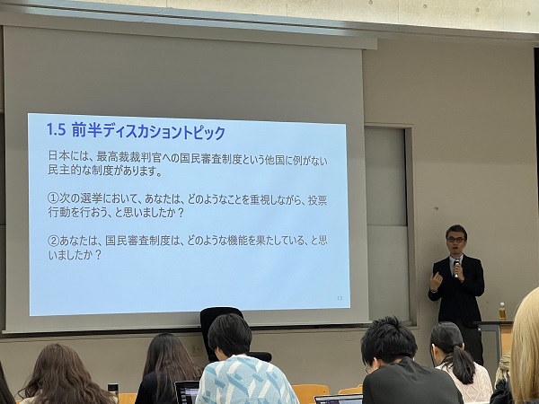 今回の講義は、裁判官の人事と判決行動を主題とするもので、日本の最高裁判事の選任過程における政治の関与や、国民審査制度における投票行動の特徴をはじめ、判決の統一性・均質性、さらには司法消極主義から司法積極主義への変化に至るまで、幅広い論点が扱われました。砂川事件や長沼ナイキ事件など、高校生にもなじみのある判例も講義内で紹介され、高校での学習内容と大学での学問との接続を意識する機会ともなりました。