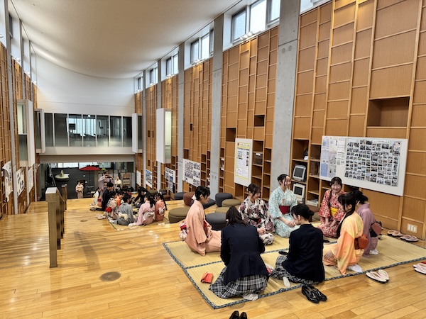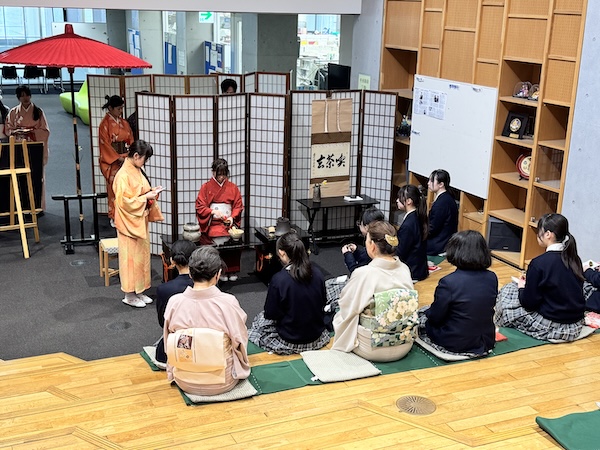 茶道部員による校内ツアーの後、中央階段で御園棚によるお手前の後、3グループに分かれて交流お茶会を行いました。生憎の雨で、花冷えの日でしたが、和気藹々としたお茶会になりました。