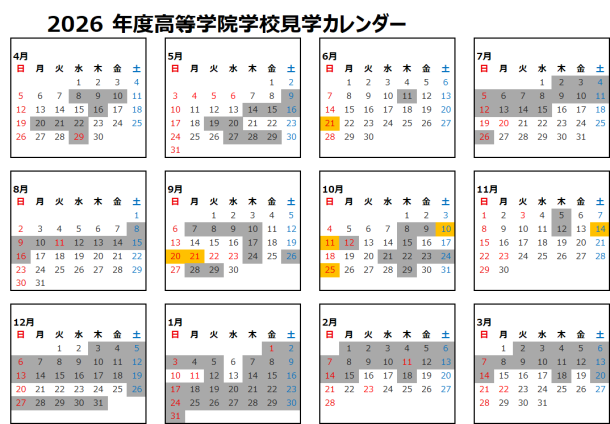 ◆見学カレンダー白色は見学可能日、グレー色は見学不可日、橙色は学校説明会・公開行事日です