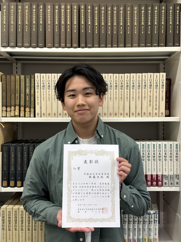 高校3年生の新藤亘琉君の研究「近世初期における塩飽人名制と年寄宮本家」が、「2025年度鳥居龍蔵記念 全国高校生歴史文化フォーラム」(徳島県立鳥居龍蔵記念博物館主催)において入賞しました。