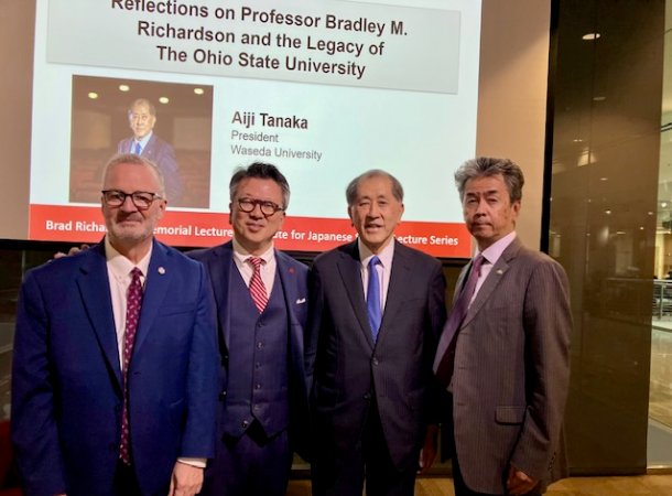 On October 28 and 29, 2025, President Aiji Tanaka visited The Ohio State University, a partner institution of Waseda University. President Tanaka was invited to deliver a lecture as part of a series of lectures celebrating the accomplishments of the late Professor Bradley Richardson, an instrumental figure in the development of Japanese studies at OSU. In addition to being the 10th year of this lecture series, 2025 marks the 40th anniversary of the establishment of The Ohio State University’s Institute for Japanese Studies as well as 40 years since President Tanaka earned his Ph.D. in Political Science from OSU under the supervision of Professor Richardson.