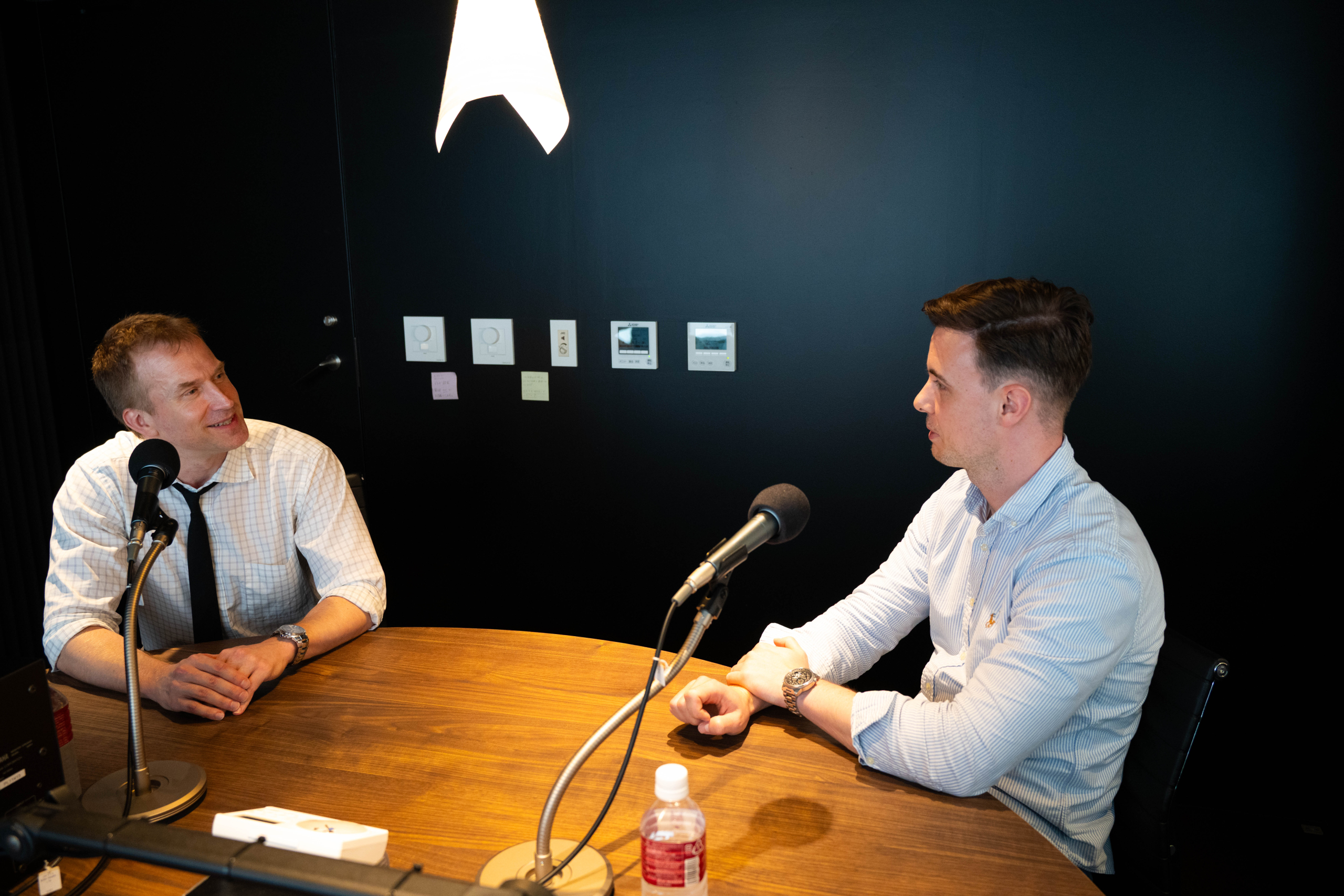 Professor Coad (left) recording with host Fabian, his former master’s student, at the Haruki Murakami Library