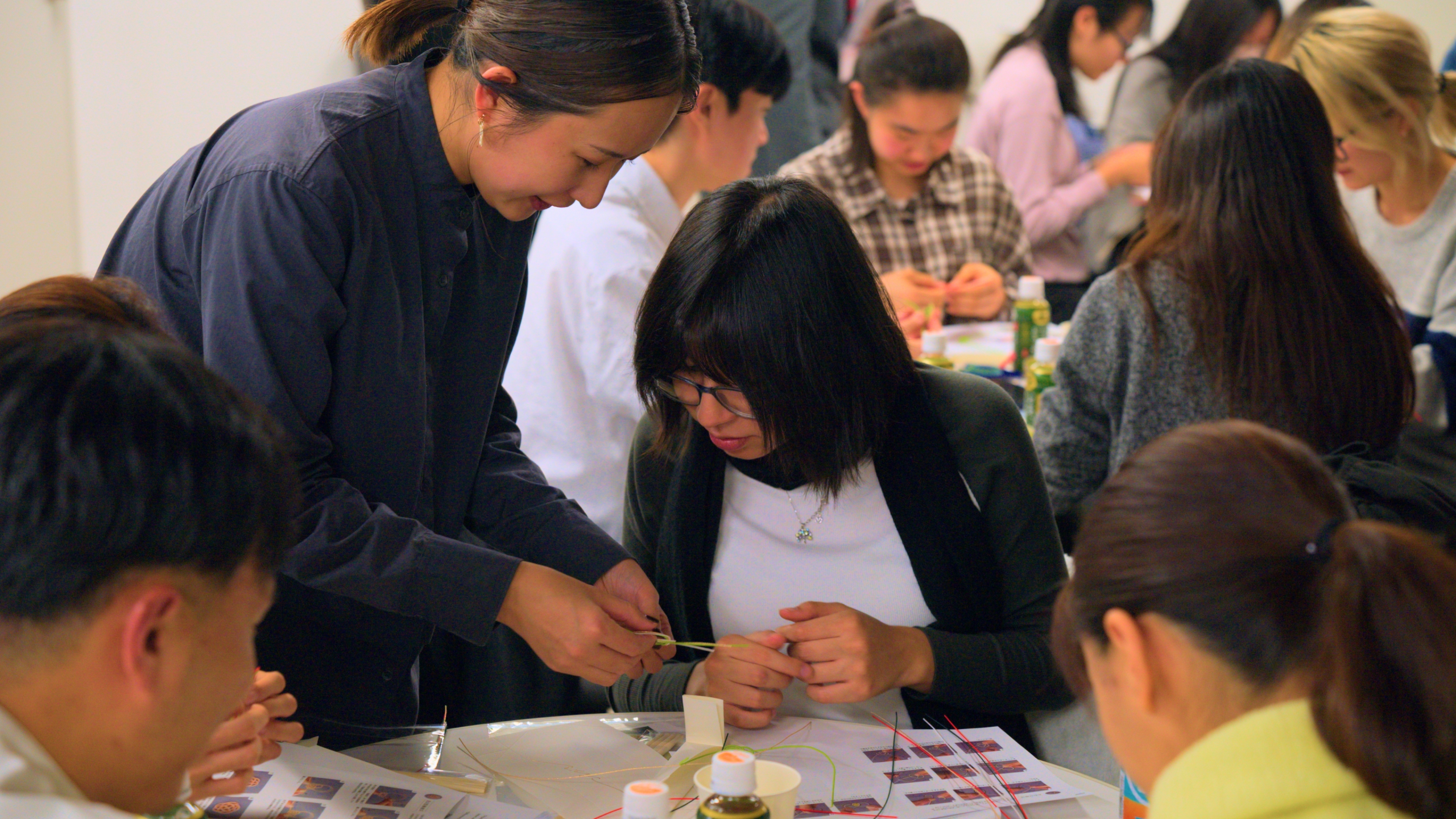 Anna Tanaka, a contemporary mizuhiki artist, served as the guest instructor for the workshop. Inspired by traditional knots, she designs pieces suited to modern lifestyles and frequently collaborates with the public through workshops, exhibitions, and her brand “hare” since 2017. The theme of this ICC workshop centered on New Year (Oshōgatsu) traditions, one of Japan’s most significant celebrations. Participants learned about New Year’s celebratory chopsticks, which are wrapped in decorative sleeves tied with mizuhiki. Creating these chopsticks sets, with the hope that they bring good fortune and protection for the year ahead, served as the main hands-on activity of the event. Under Tanaka’s guidance, participants learned about the materials and how to properly handle mizuhiki cords, such as adjusting tension and shaping curves. With this foundation, participants practiced creating an Awabi knot with one cord. The challenge increased when creating a free-standing plum blossom knot, which requires much more attention as it uses three cords. The final task was attaching the plum blossom to a chopstick sleeve using a makoto-musubi (true knot), which each attendee could bring home.