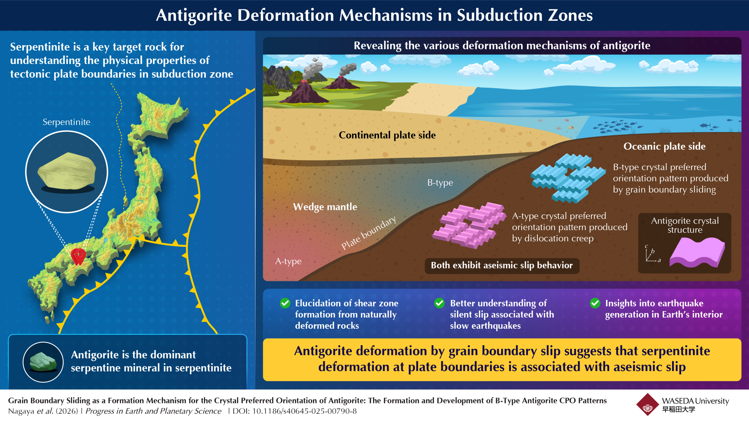 Motivated by this puzzle, a team of researchers, led by Associate Professor Takayoshi Nagaya from the Department of Earth Sciences, Waseda University, Japan, including Professor Simon R. Wallis from The University of Tokyo, Japan, has demonstrated that grain boundary sliding (GBS) can form the most common natural CPO pattern, known as the “B-type,” in which the crystallographic b-axes of antigorite are preferentially aligned parallel to the shear direction. Their findings have been published in Volume 13, Issue 4 of the Progress in Earth and Planetary Science journal on January 21, 2026.