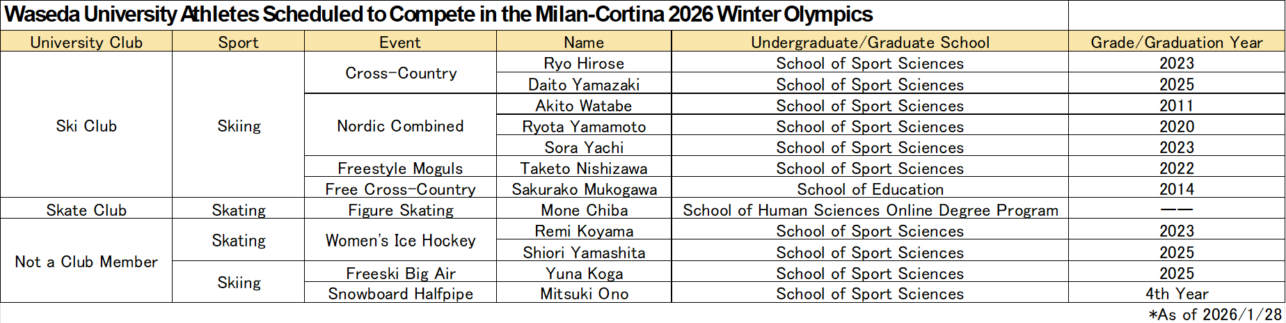 The Milan-Cortina 2026 Winter Olympics will begin on February 6th. As of January 28th, two current Waseda students and ten alumni have been selected to represent Japan.