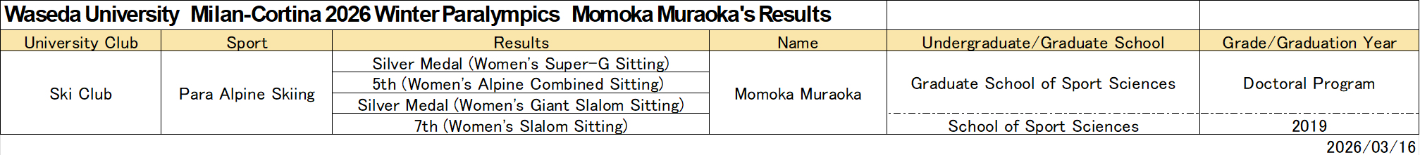 At the Milan-Cortina 2026 Winter Paralympics on March 12, Momoka Muraoka (Graduate School of Sport Sciences), a former member of Waseda University’s ski club, won her second silver medal of the Games in the Para Alpine Skiing Women’s Giant Slalom Sitting event. Her total number of individual medals won at a Winter Paralympics has now reached 11, surpassing the 10 medals won by Kuniko Obinata (2017 graduate from the Graduate School of Sport Sciences), the Head of Team Japan, making her the Japanese athlete with the most medals won.