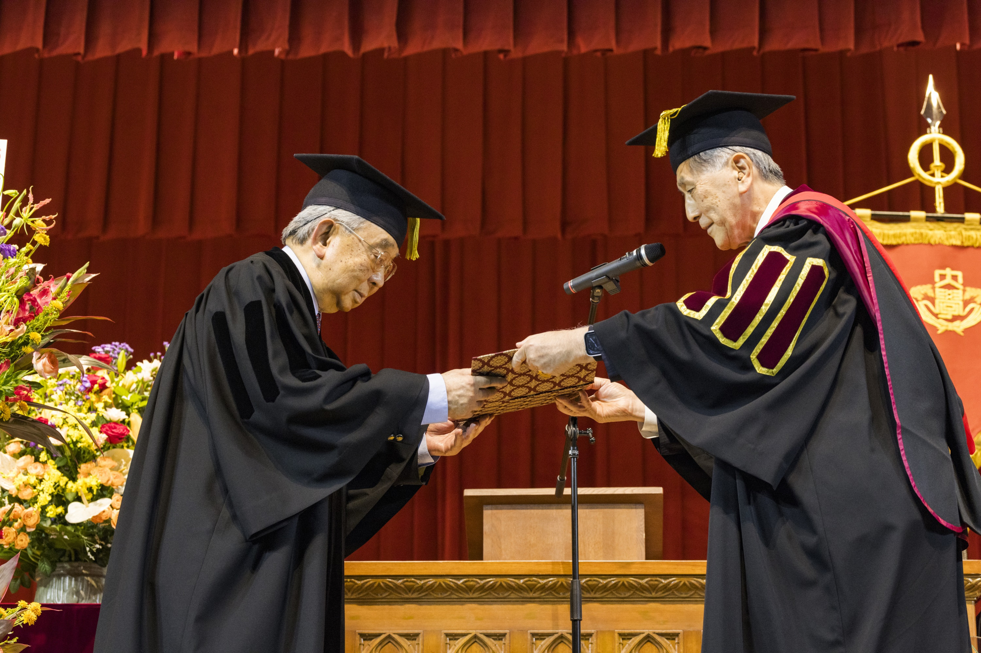 早稲田大学は2025年9月21日、田中愛治総長より、百賢基金会創立者である曹其鏞(ロナルド・チャオ)氏へ名誉博士号を贈呈しました。この日、戸山キャンパスの早稲田アリーナにて催した2025年度9月入学式の式典の中で贈呈式は行われ、多くの本学卒業生、教職員が百賢基金会関係者とともに本贈呈式に参加しました。