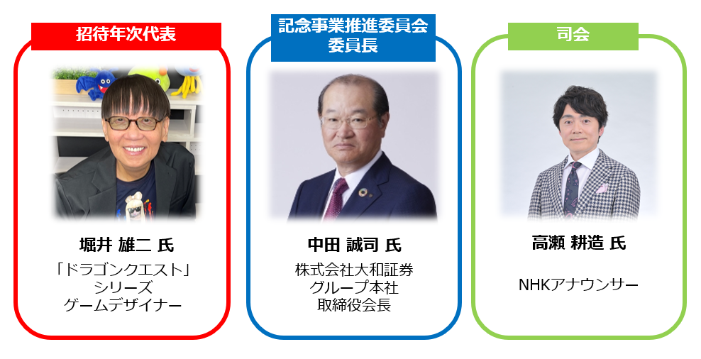 本セレモニーでは、記念事業推進委員会委員長である株式会社大和証券グループ本社 取締役会長 中田 誠司氏のご挨拶に加え、国民的RPG「ドラゴンクエスト」シリーズの生みの親であるゲームデザイナーの堀井 雄二氏、NHKアナウンサーの高瀬 耕造氏をはじめ、多彩な分野で活躍する校友が登壇します。