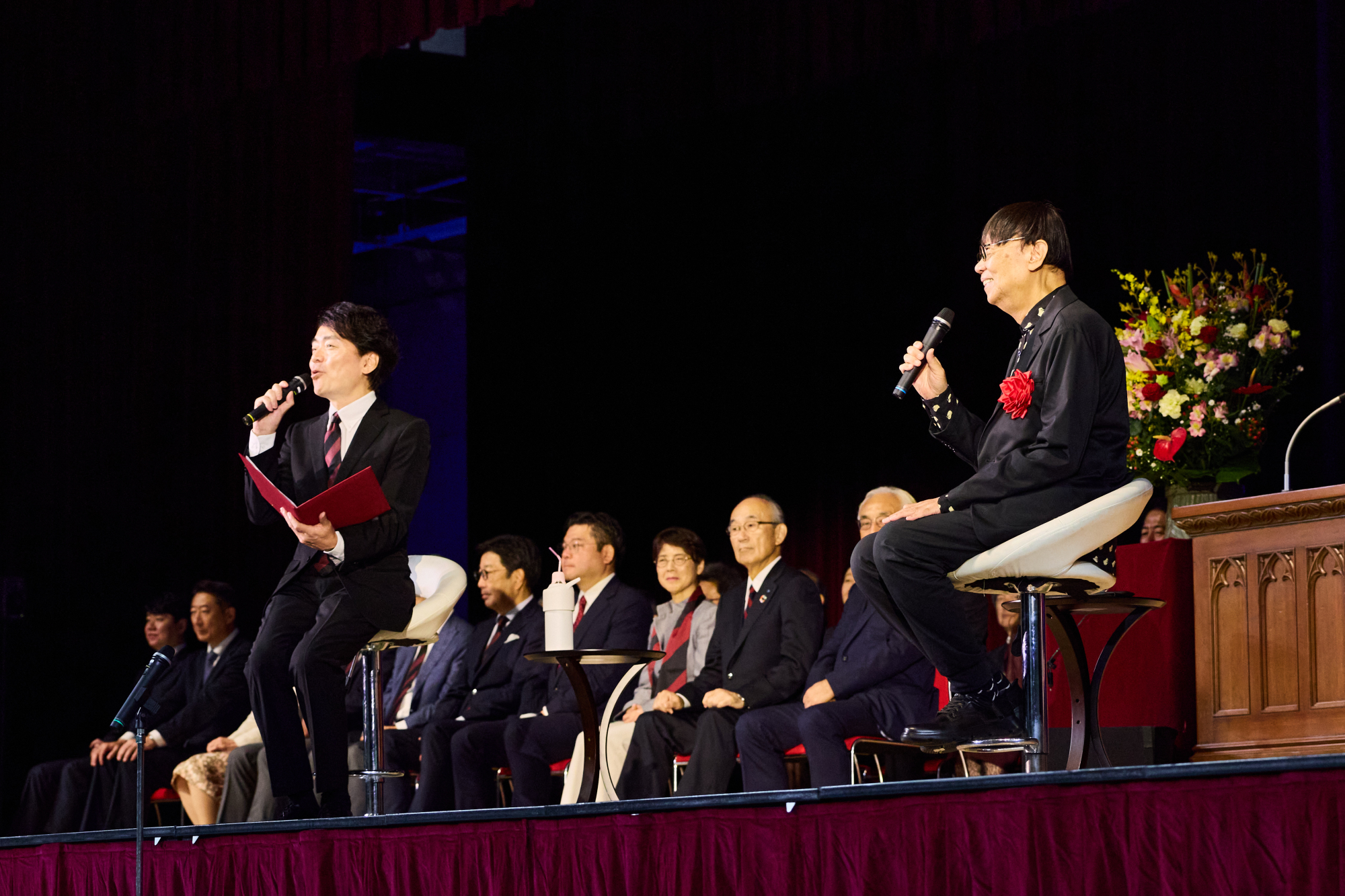 セレモニーでは特別企画として、ゲームデザイナーの堀井雄二氏(1978年第一文学部卒業)と高瀬耕造氏が対談。国民的RPG「ドラゴンクエスト」シリーズの生みの親である堀井氏の活躍について語り合いました。
