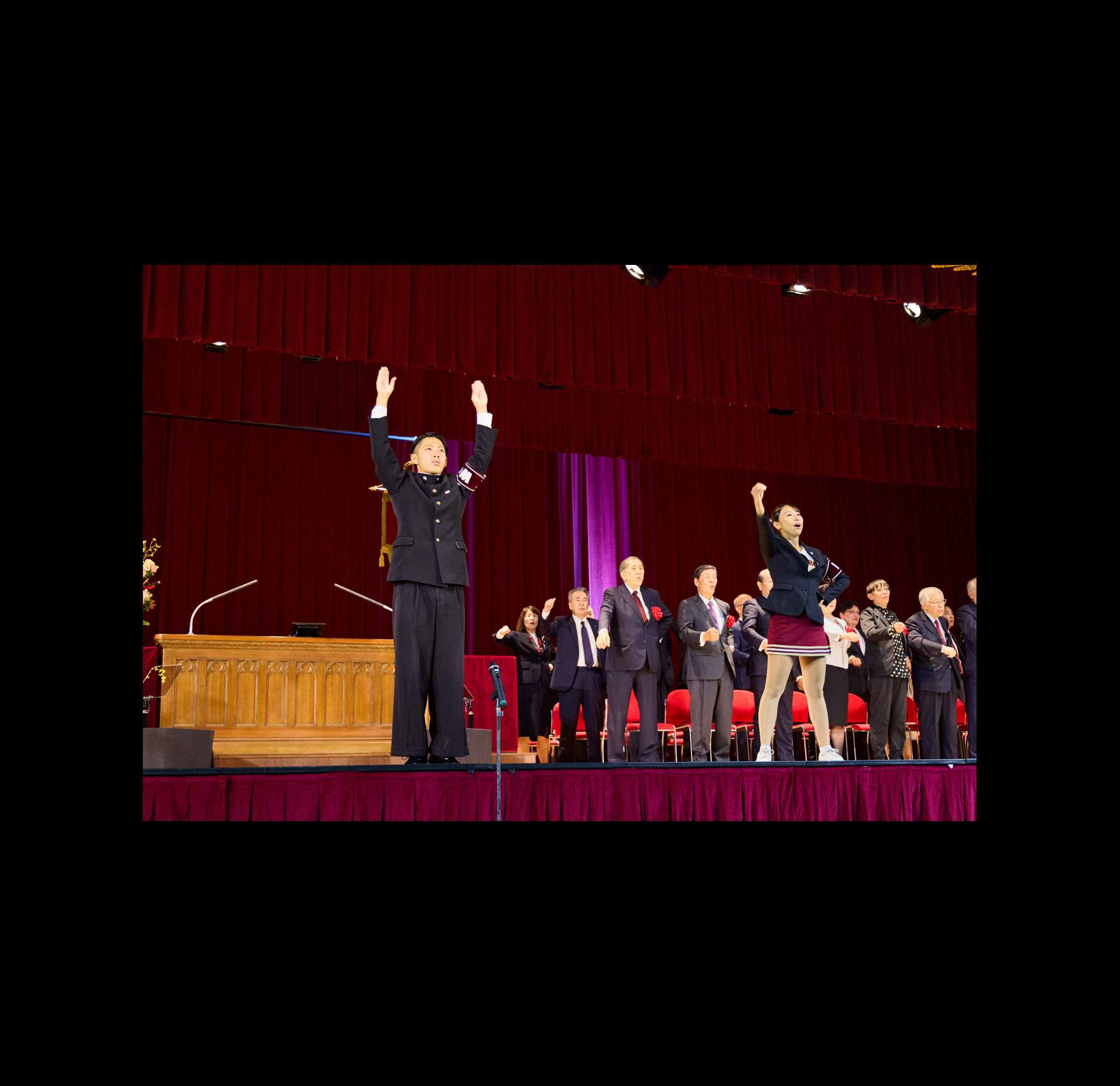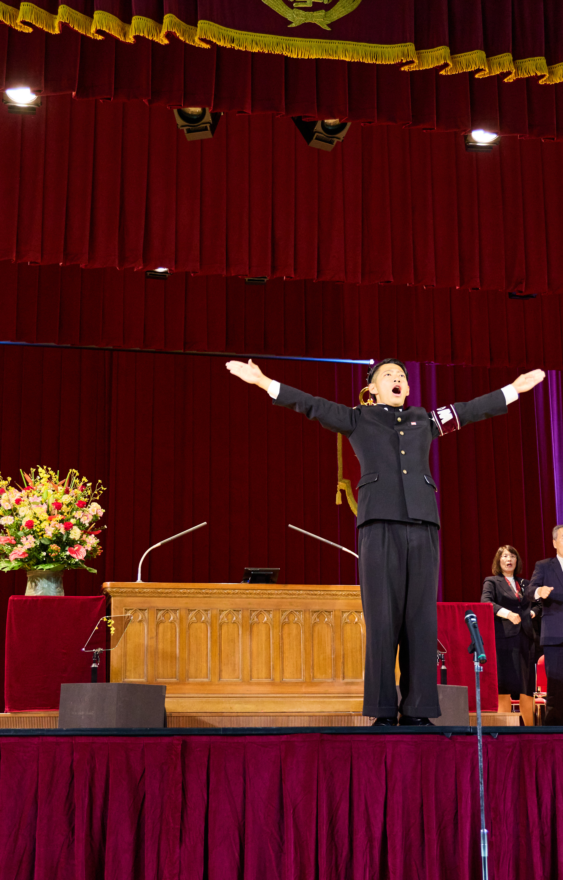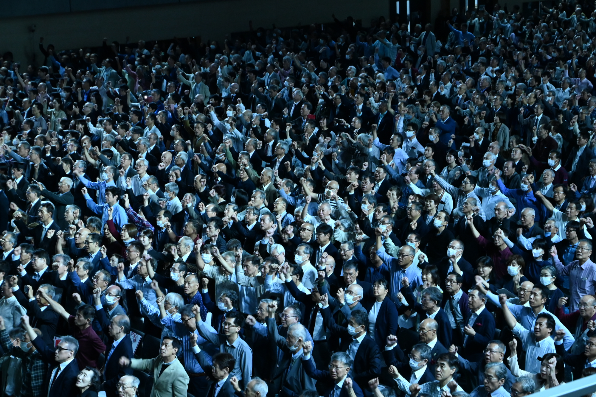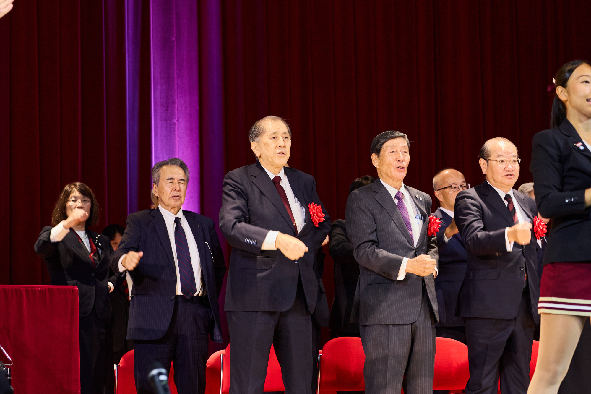 トークセッションの後、応援部のパフォーマンスと共に登壇者・来場者は右手を振り上げながら校歌を斉唱。最後は田中総長による創立150周年に向けた「校友諸君!校友が一番応援する大学は早稲田か!」の掛け声に、会場全体が「そうだ!」と応え、盛大な拍手と熱気の中、セレモニーは幕を閉じました。