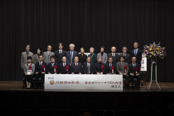 このたびは、栄えある「石橋湛山記念 早稲田ジャーナリズム大賞」をいただきまして、誠にありがとうございます。私たちが取り組んだ兵庫県の問題をめぐっては、今月に入り捜査当局の大きな動きがありました。ただ、この「石橋湛山記念 早稲田ジャーナリズム大賞」については、この捜査当局の動きがある前に、私たちに対する授賞を決めていただきました。私たち「報道特集」のスタッフ一同、孤立無援を感じることが多かっただけに、このような励ましをいただいたことは誠に大きな意義があり、大きな励みとなりました。本当にありがとうございました。