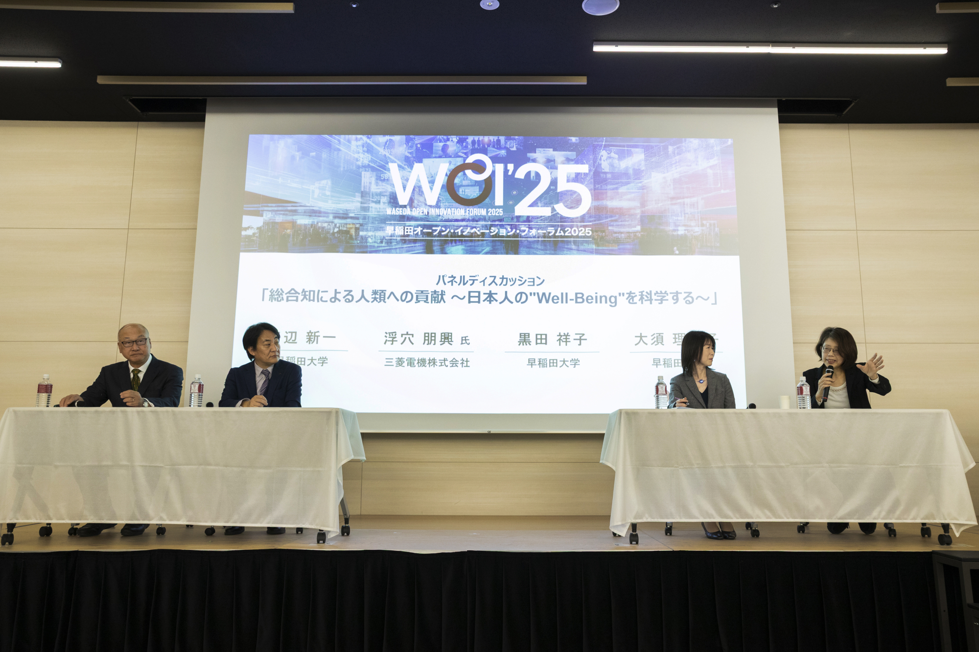 121号館のコマツ100周年記念ホールで行われたパネルディスカッション「総合知による人類への貢献 ~日本人の”Well-Being”を科学する~」では、田辺新一教授がファシリテータを務め、早稲田大学と包括連携に関する基本協定を締結している三菱電機株式会社の浮穴朋興氏をはじめ、黒田祥子教授、大須理英子教授が、世界的に注目が集まるWell-Beingについて最新の知見を共有しました。