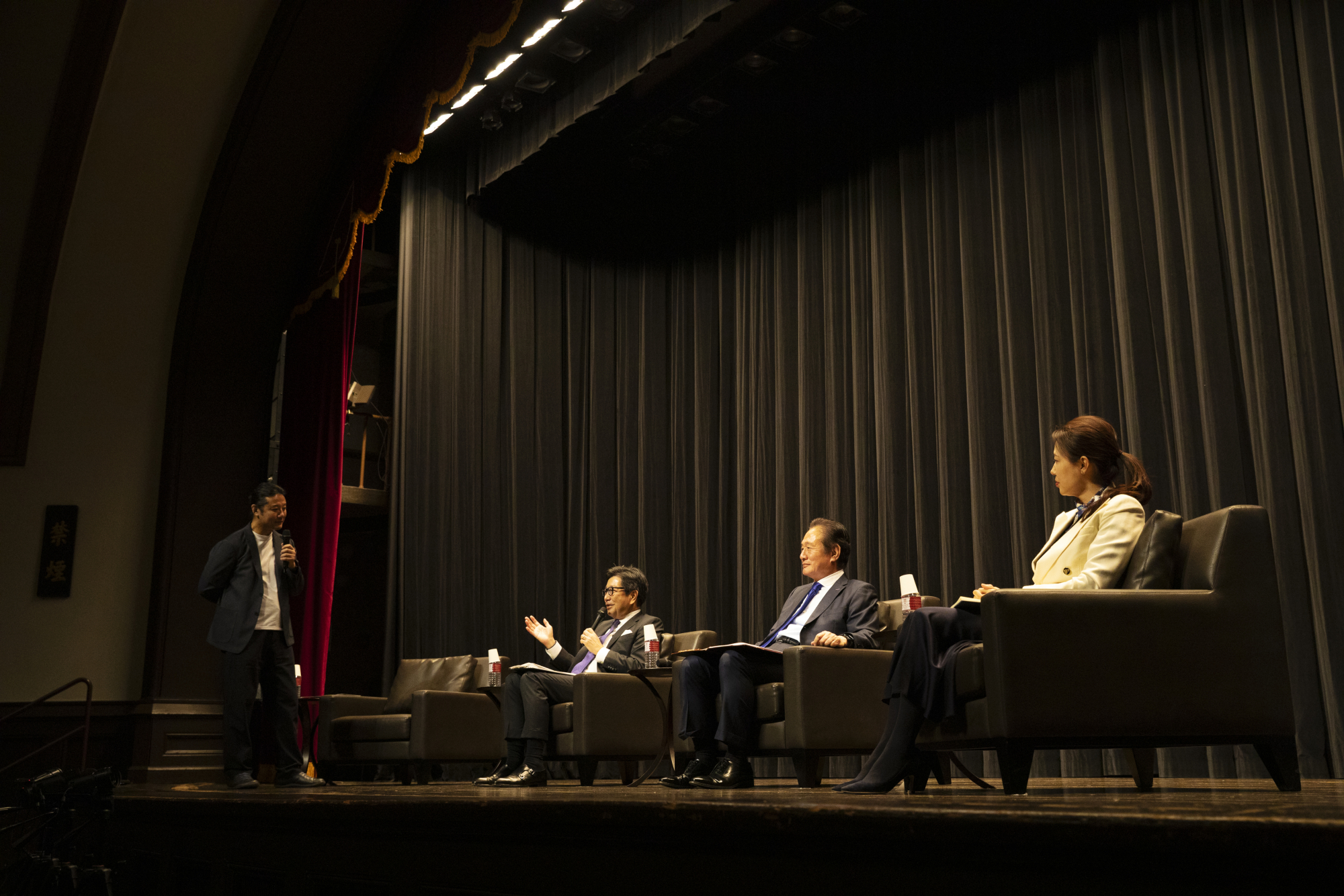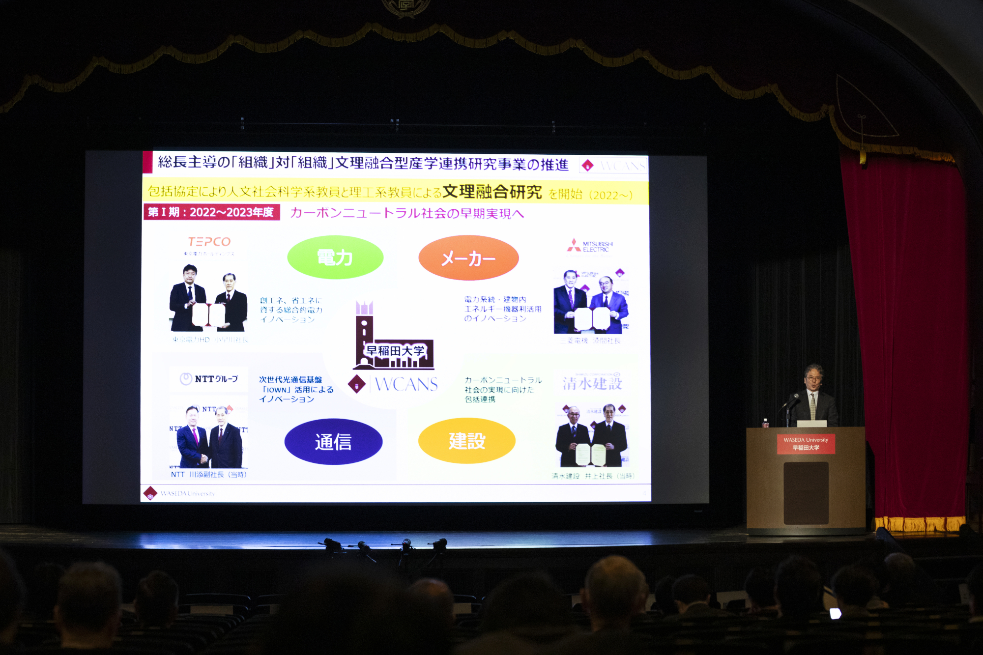 大隈記念講堂大講堂で行われた「【WCANS】産学包括連携によるイノベーションの共創へ」では、早稲田大学が産学包括連携協定を締結した関西電力株式会社、株式会社島津製作所、株式会社日建設計において、イノベーションの共創を牽引されている3名の方々に登壇いただきました。
