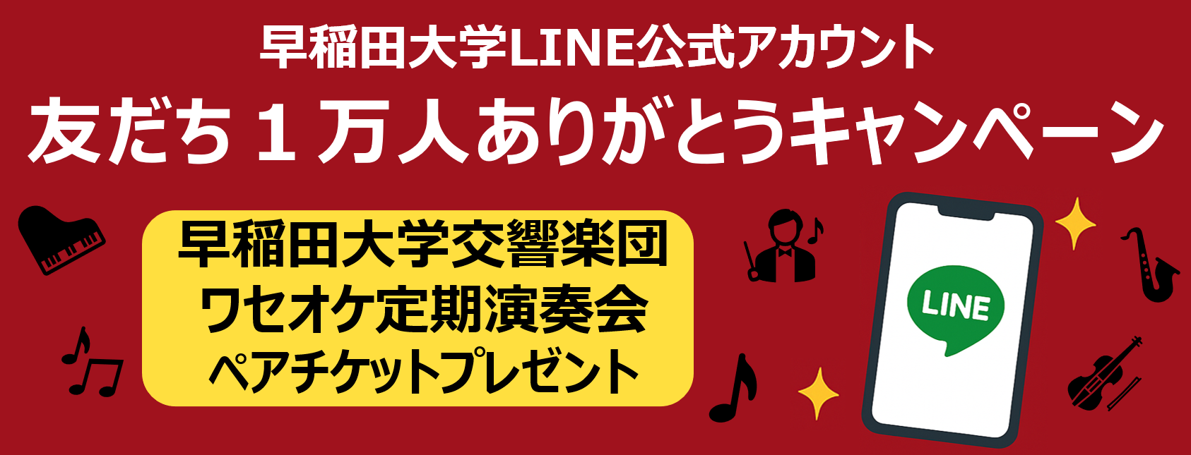 このたび、友だち1万人を記念して、所定のお手続きをいただいた方の中から、抽選で「早稲田大学交響楽団(ワセオケ)定期演奏会 ペアチケット」をプレゼントいたします。