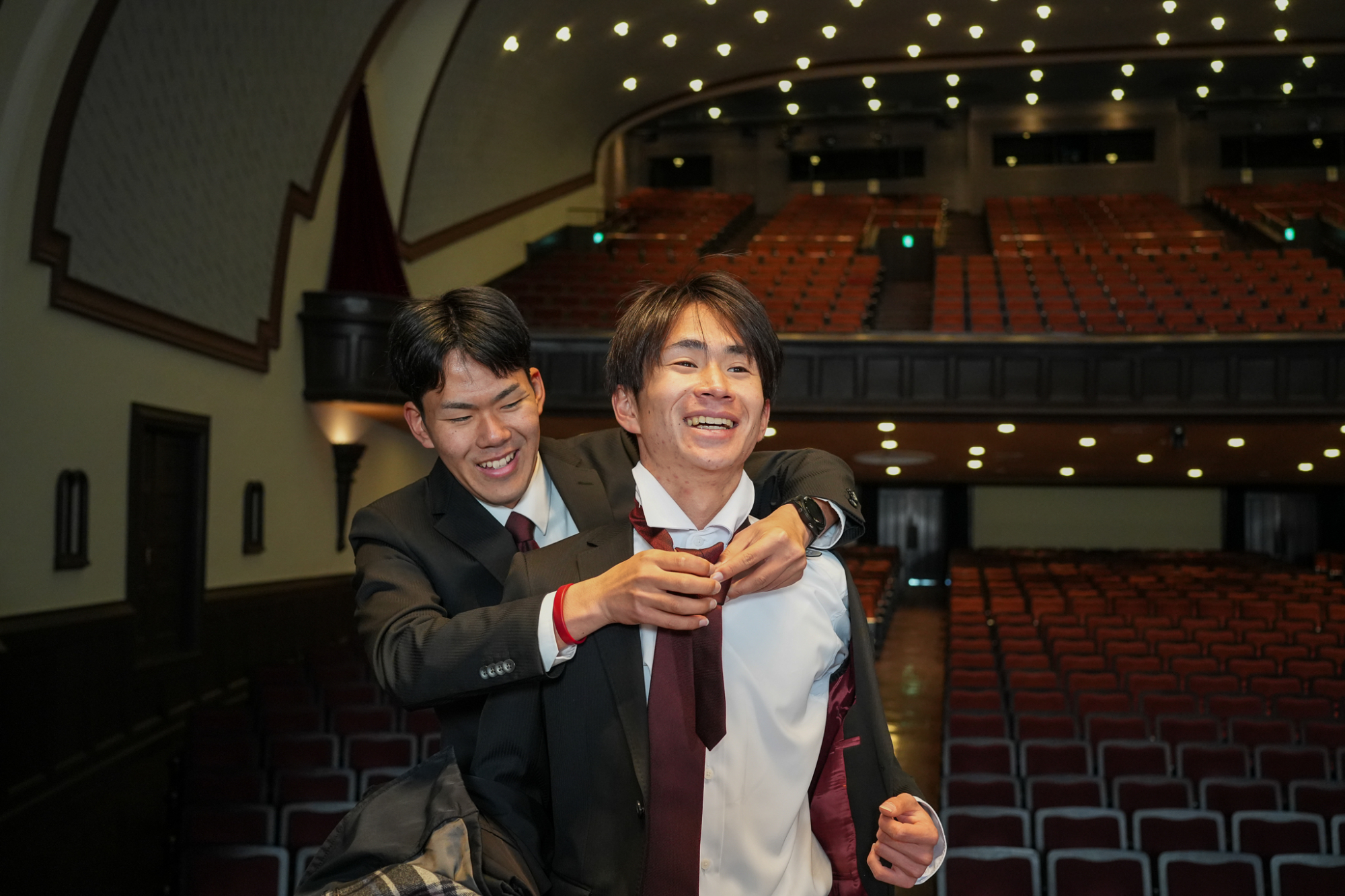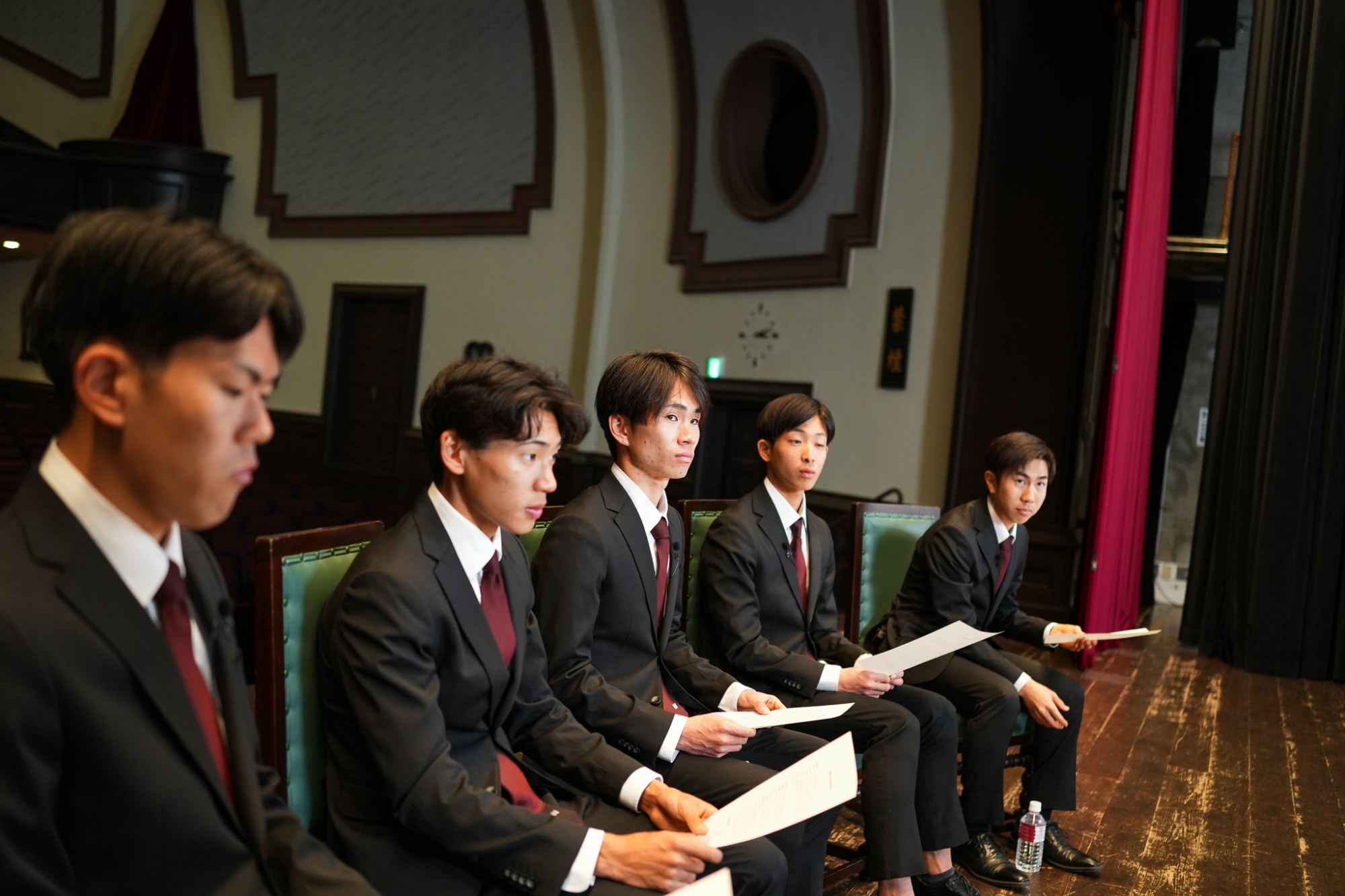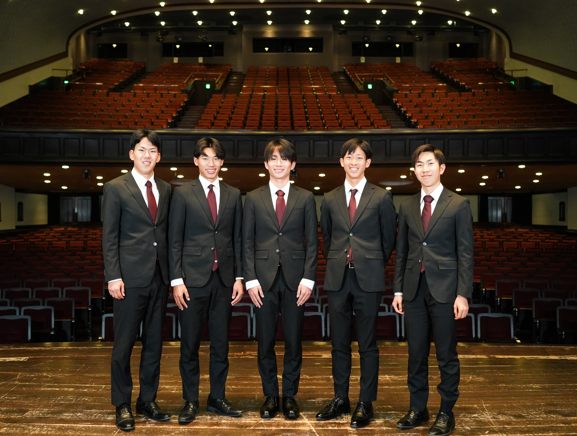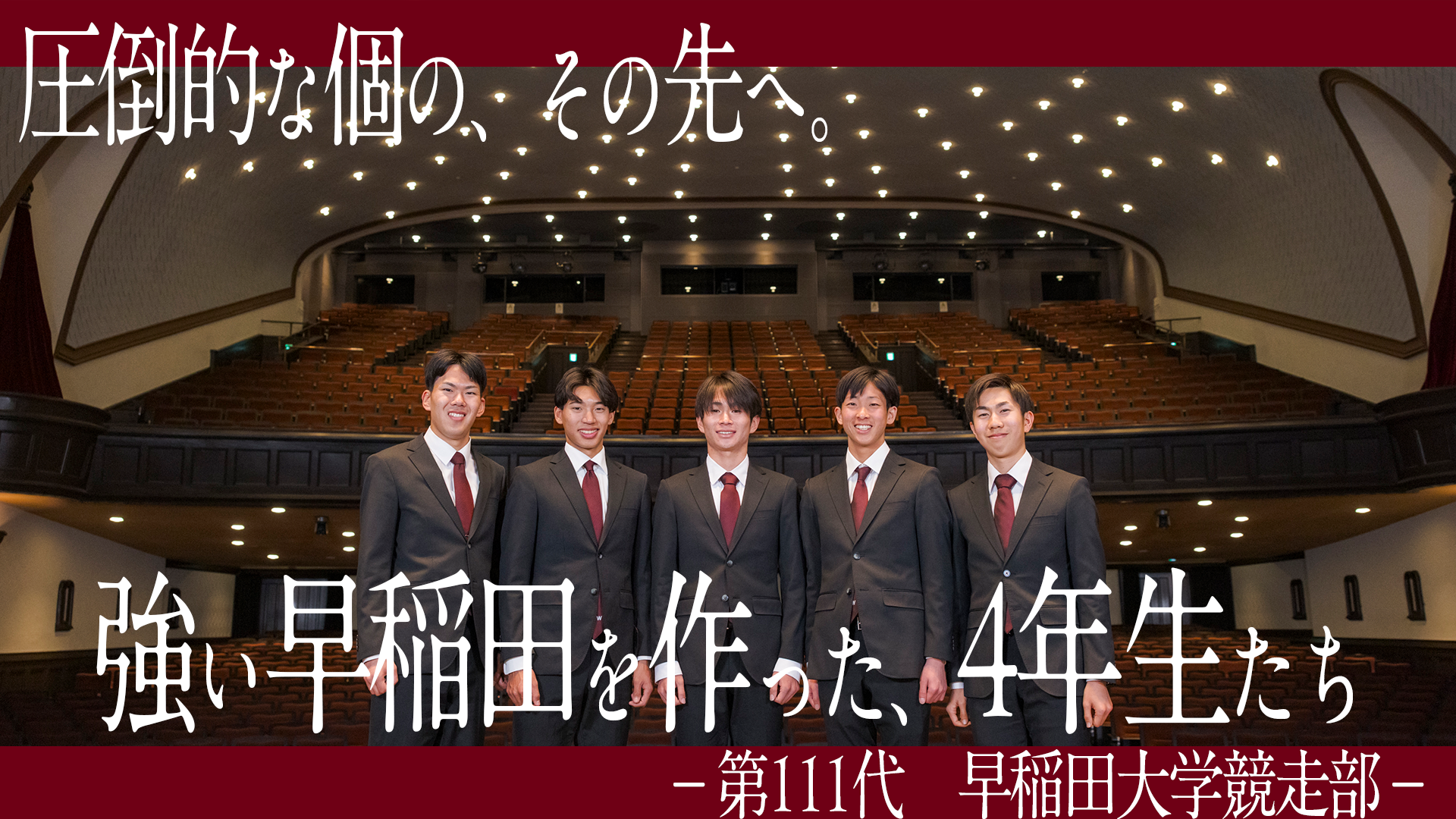 臙脂色を裏地にあしらった揃いのオーダースーツを身に纏って、大隈記念講堂の壇上に並んだのは、競走部駅伝チームの4年生たち。