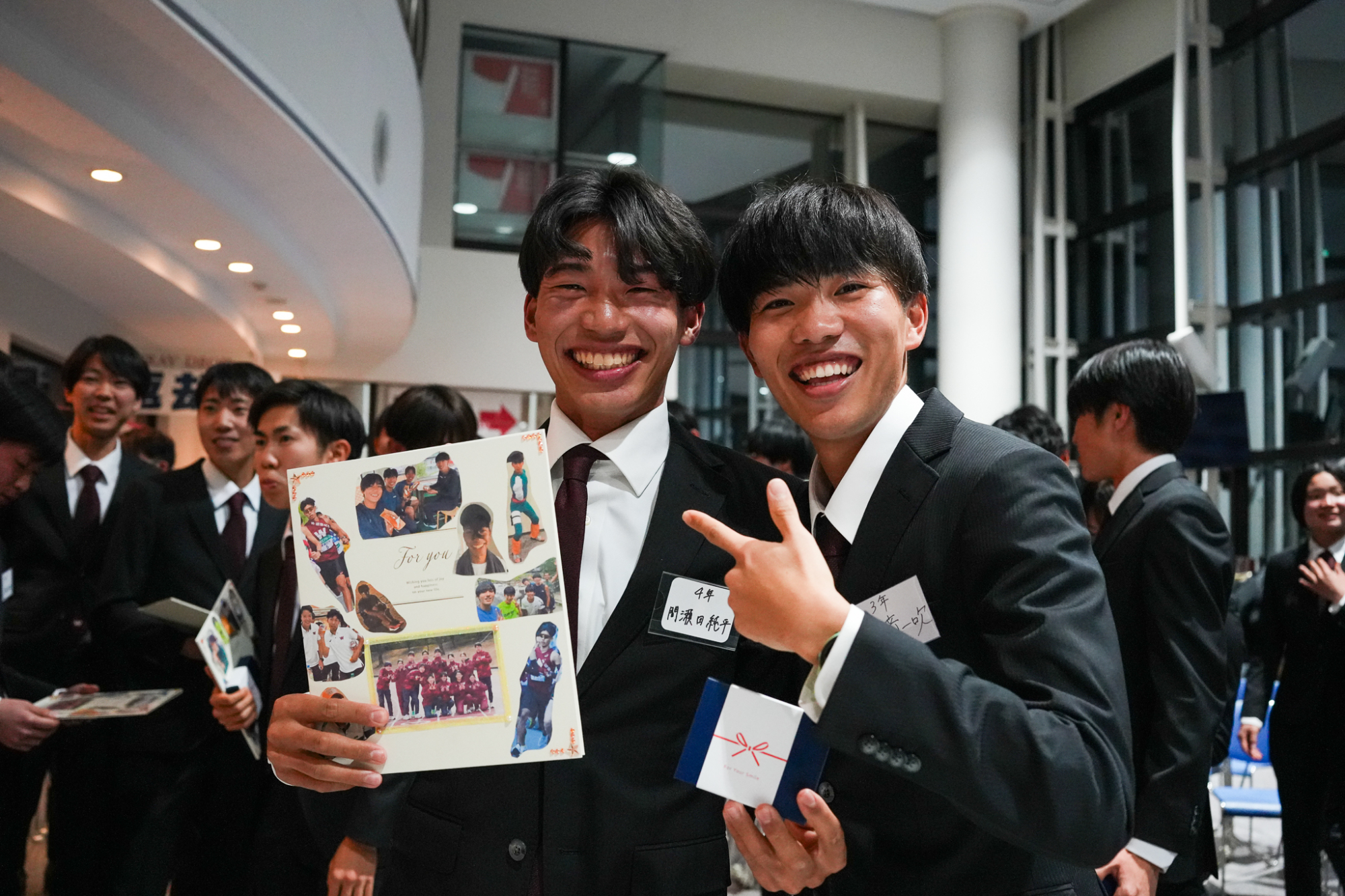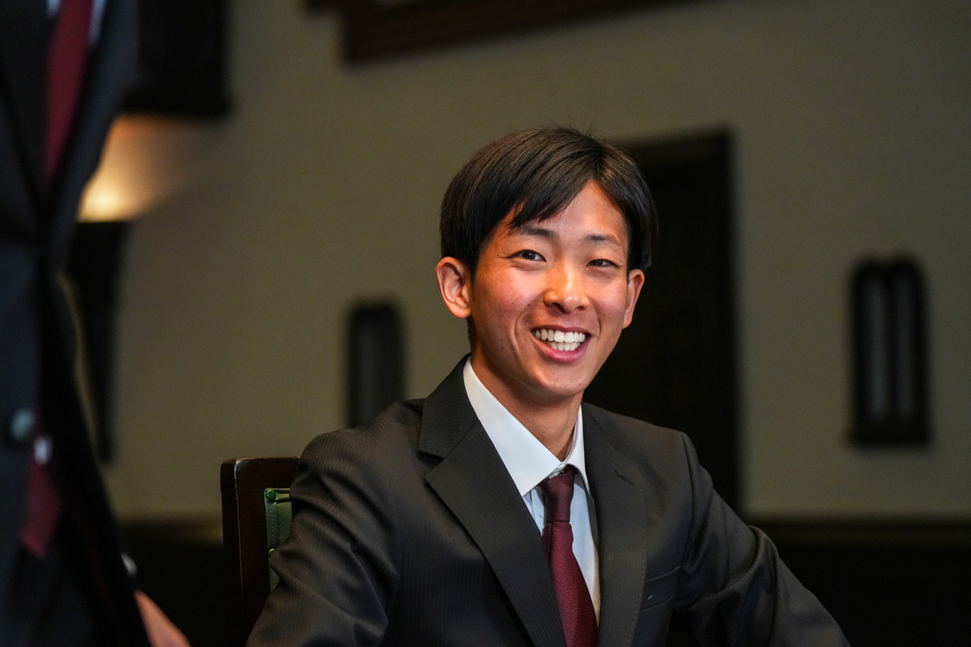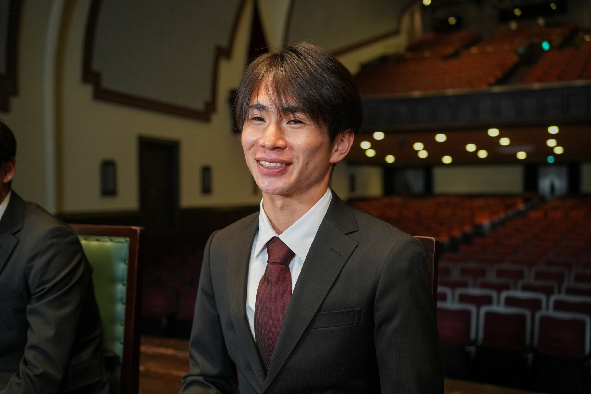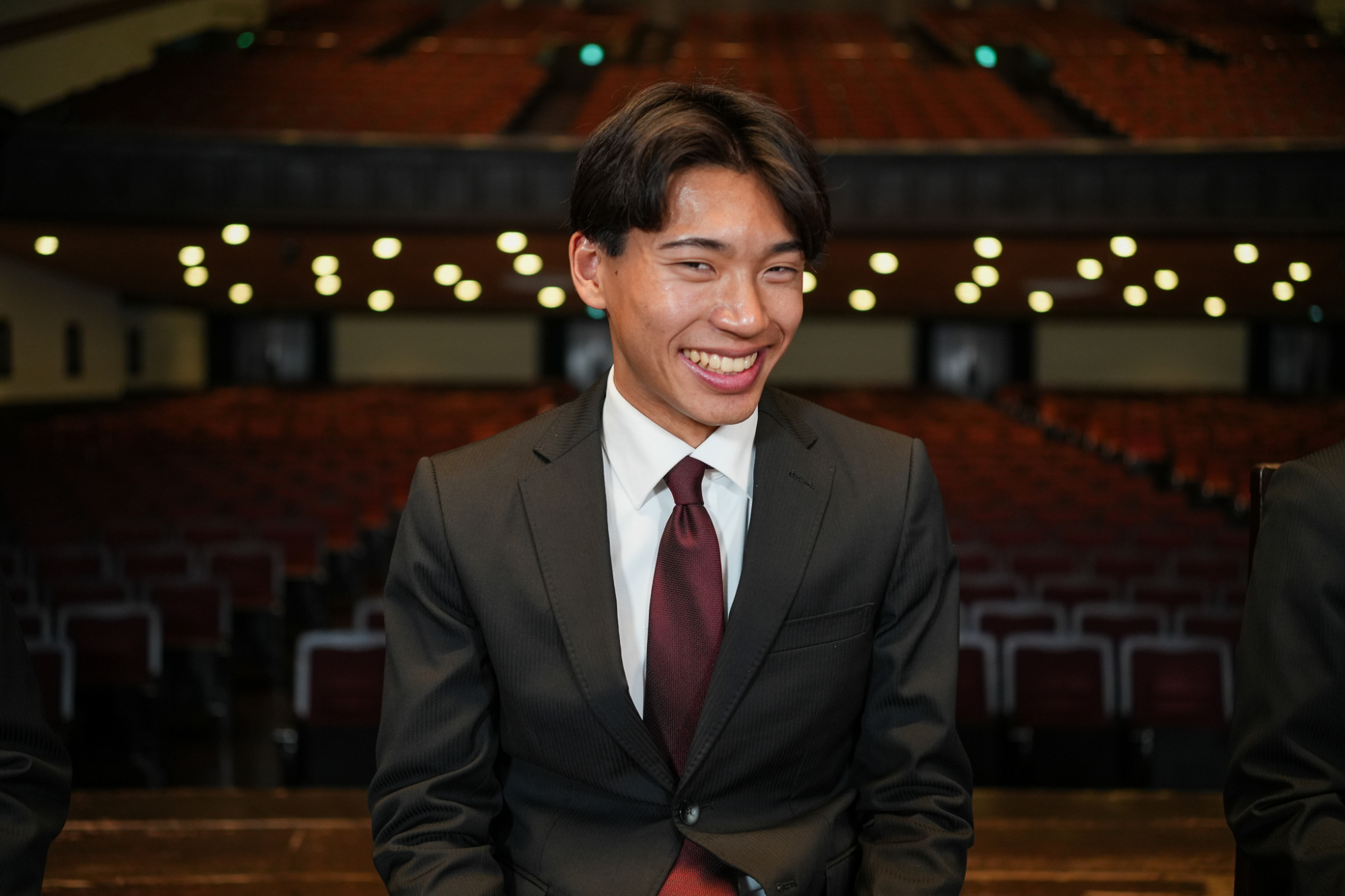 臙脂色を裏地にあしらった揃いのオーダースーツを身に纏って、大隈記念講堂の壇上に並んだのは、競走部駅伝チームの4年生たち。