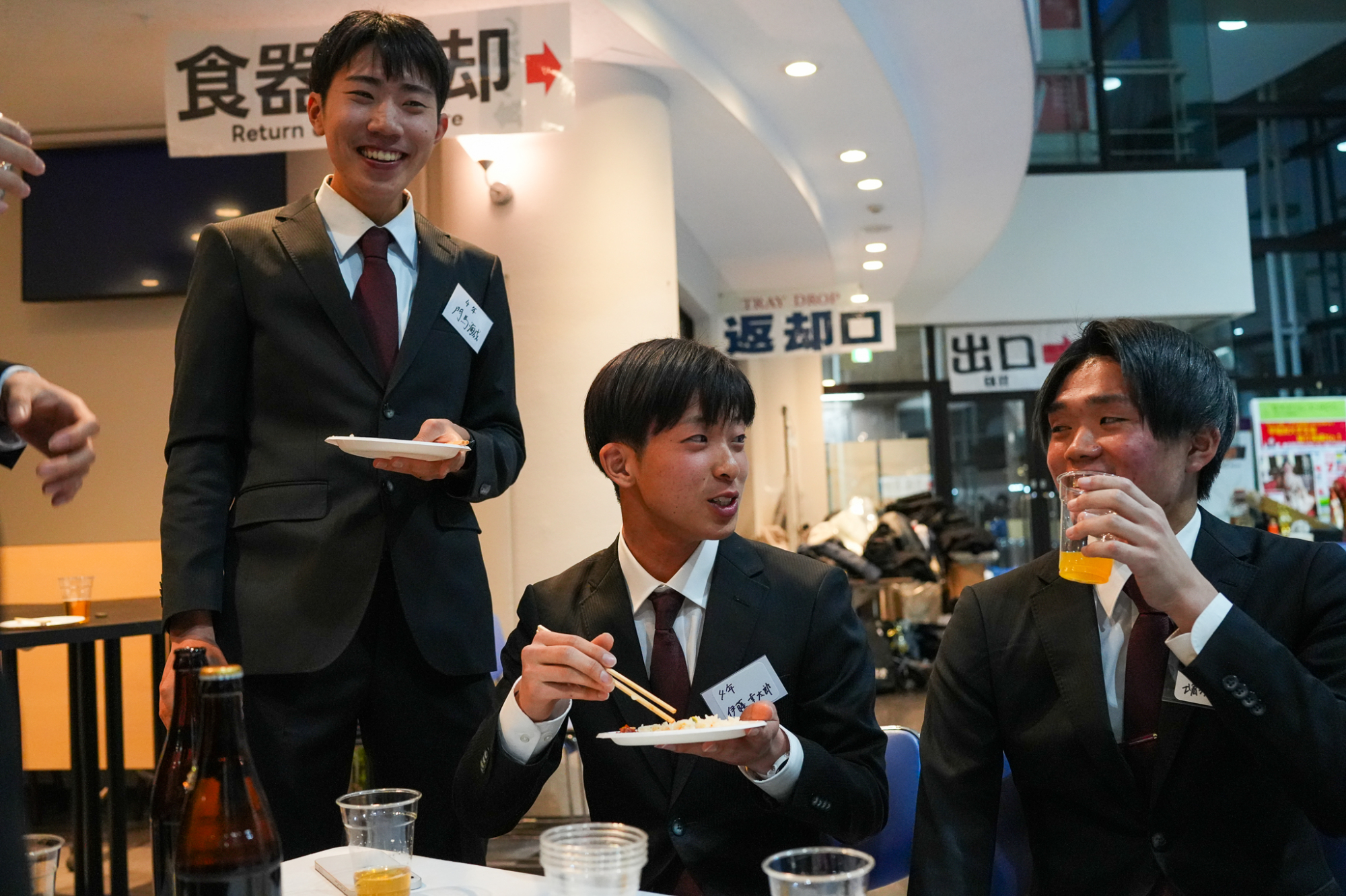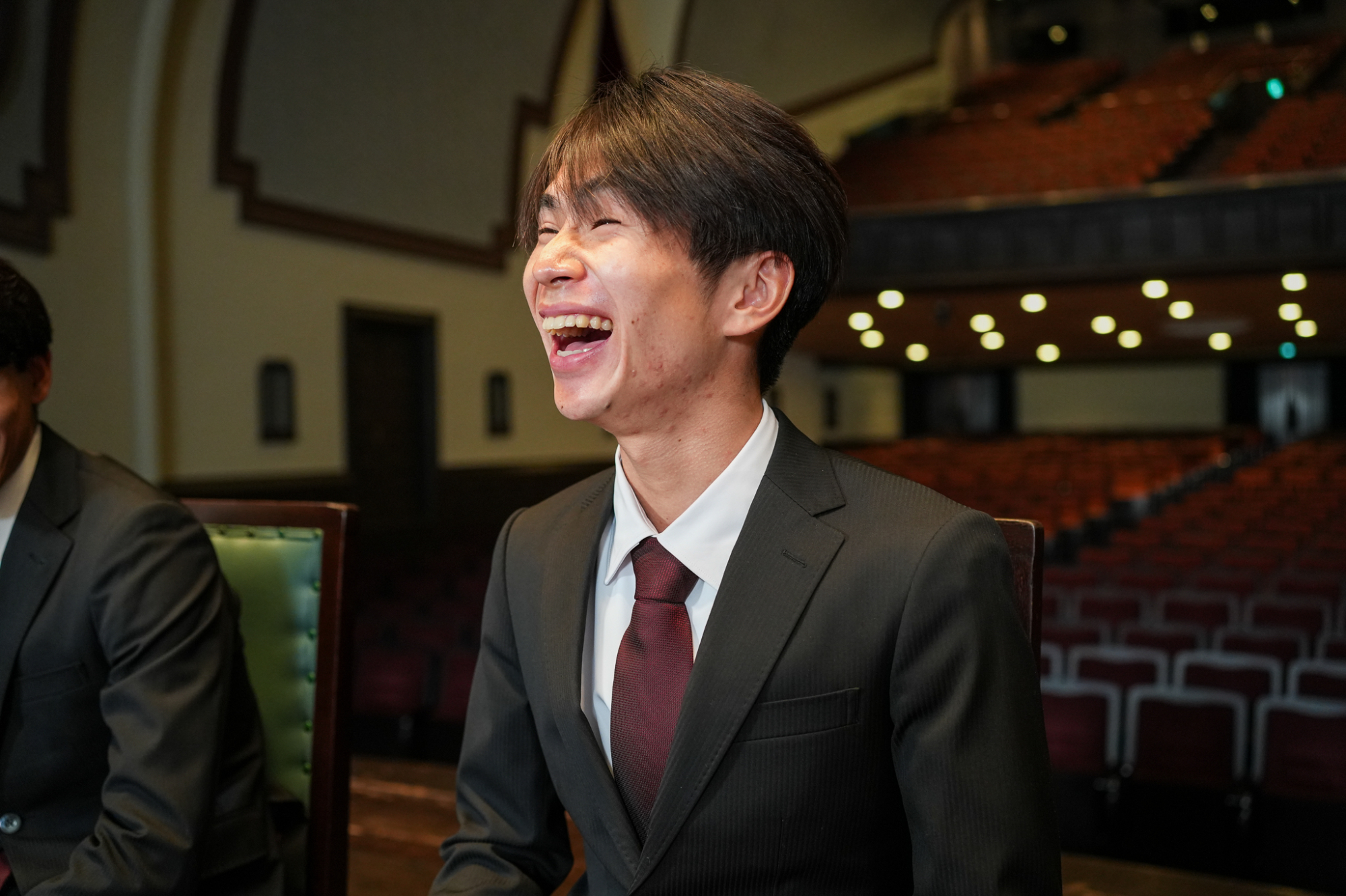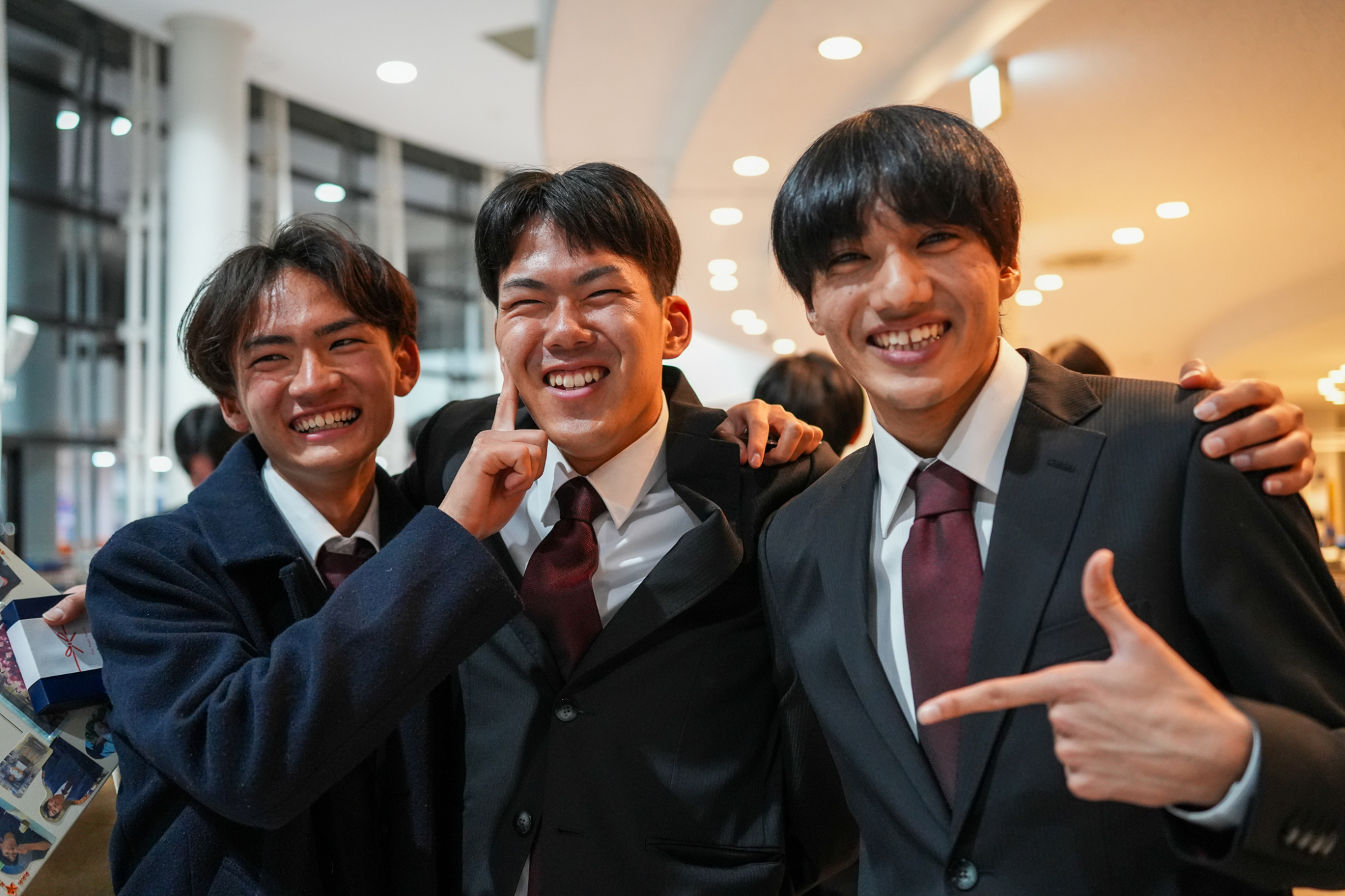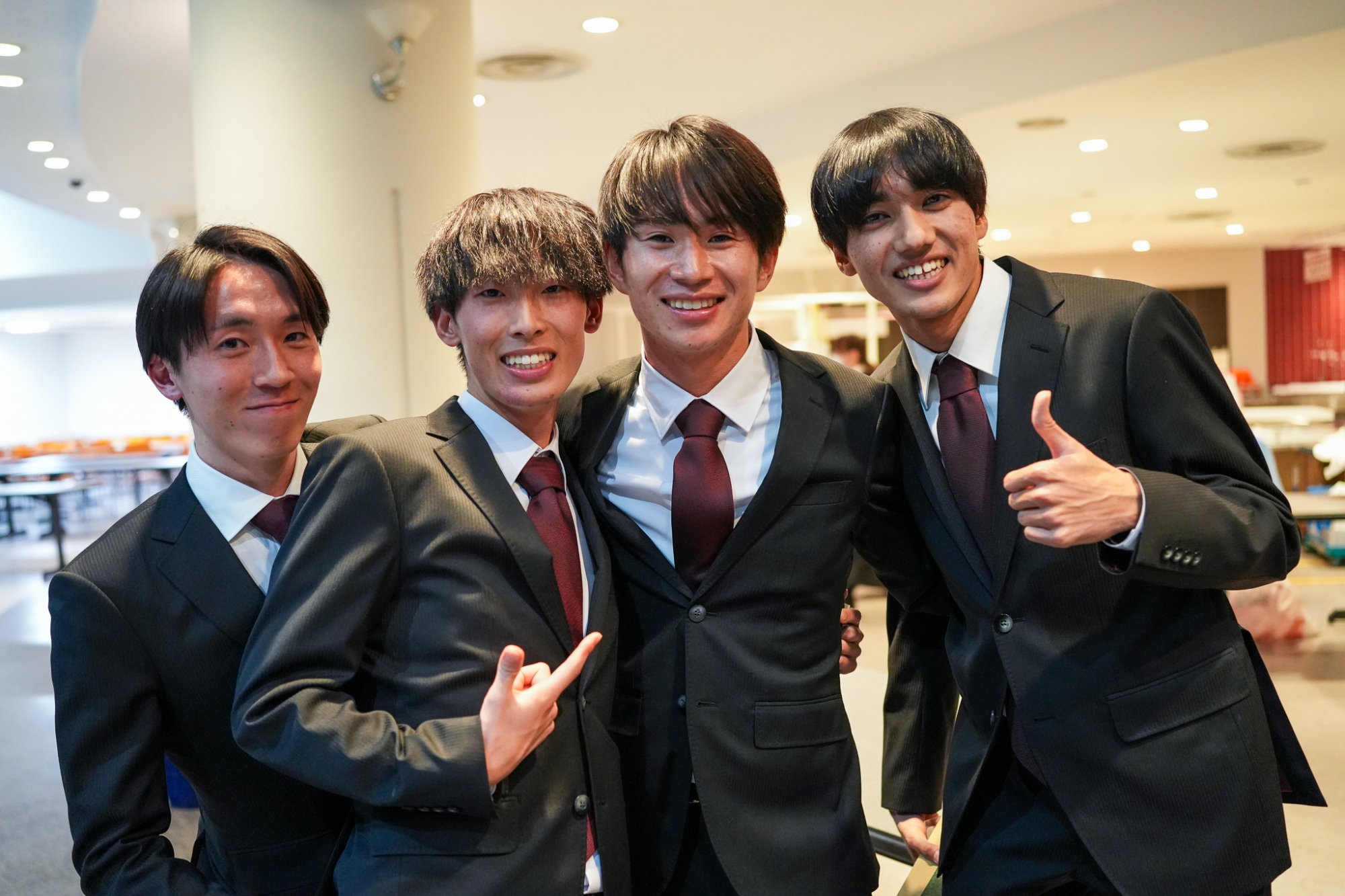 臙脂色を裏地にあしらった揃いのオーダースーツを身に纏って、大隈記念講堂の壇上に並んだのは、競走部駅伝チームの4年生たち。