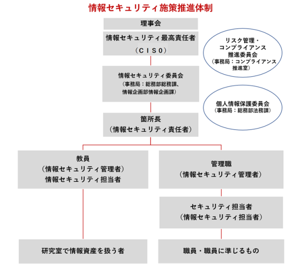 各箇所に情報セキュリティ責任者(箇所長)を置き、各箇所の情報セキュリティ責任者は、その箇所で保有する情報資産に責任を持つ。各箇所に情報セキュリティ管理者および情報キュリティ担当者を置き、箇所に必要な情報セキュリティ実施手順を策定し、維持するための活動を行う。